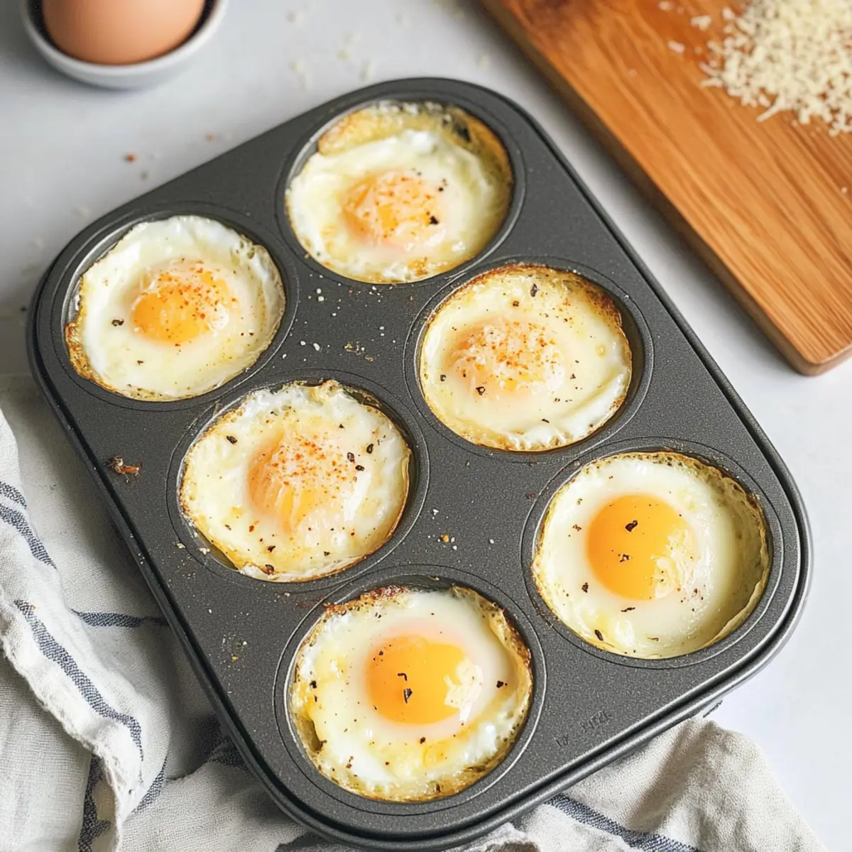 - Sprinkle approximately 1 tablespoon of Parmesan cheese on top of each egg.