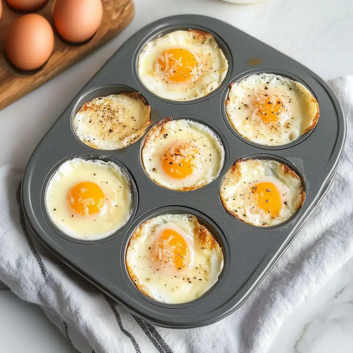 Carefully crack one large egg into each muffin cup of your prepared pan. Ensure that the eggs are fresh, as this will enhance both the flavor and presentation of your Baked French Eggs. As you work, take a moment to admire the bright yellow yolks, which promise to create a rich and satisfying dish when baked.