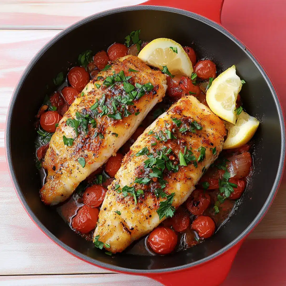 - Remove the cod from the oven, let it rest, garnish with chopped parsley and a squeeze of lemon juice, then serve.