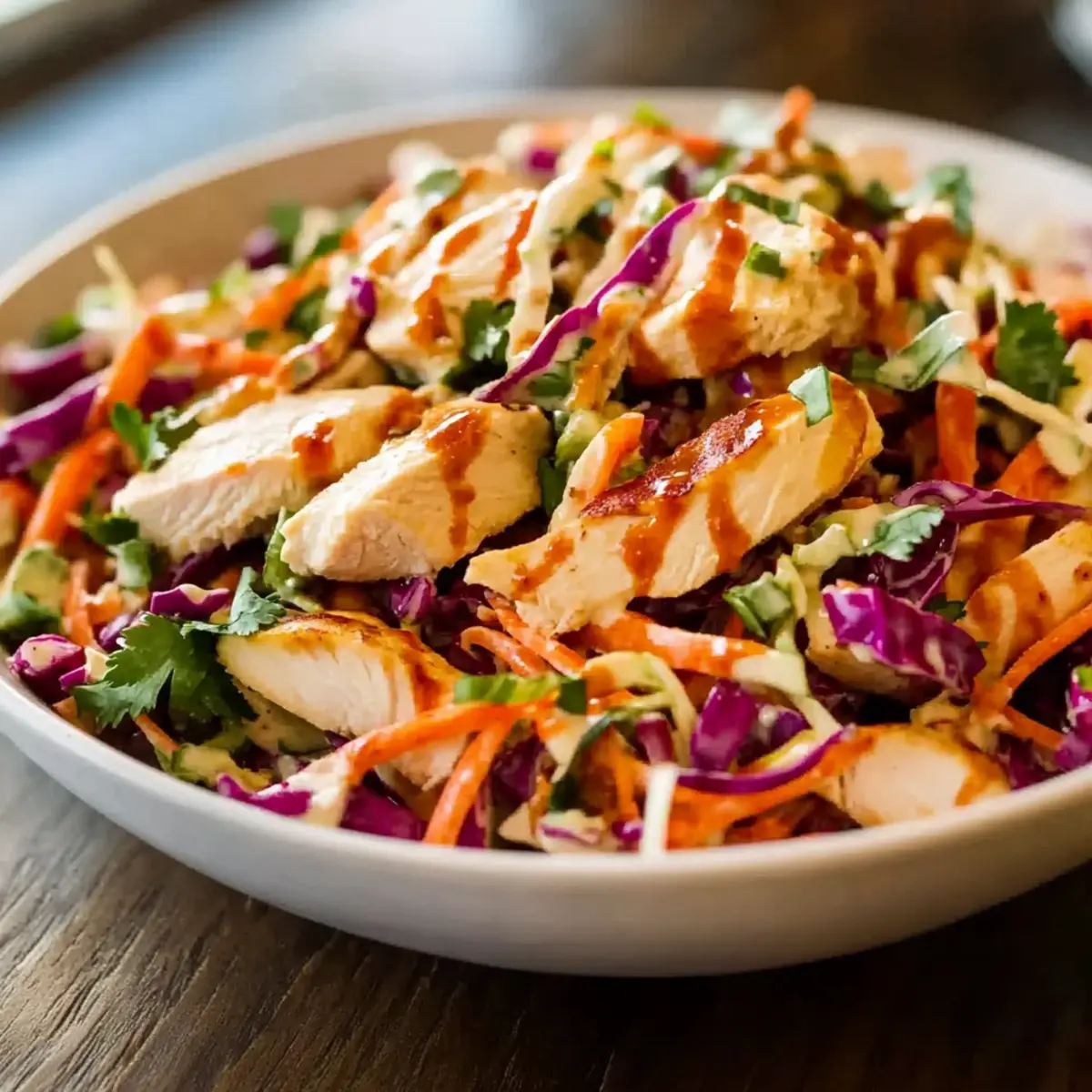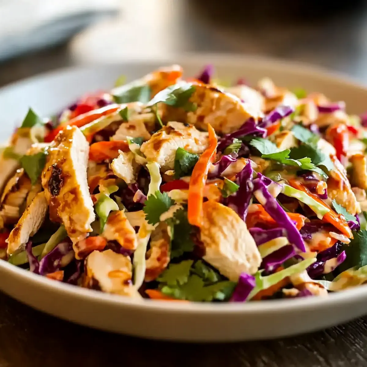 - Toss Salad: Pour the chicken mixture over the slaw vegetables, gently tossing to distribute evenly without bruising the veggies.