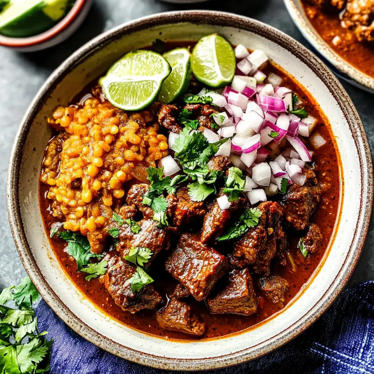 Once the beef is tender, carefully skim any excess oil from the top of the Beef Chile Colorado to achieve a cleaner finish. Serve the stew hot with warmed corn tortillas and garnish with diced white onion, fresh cilantro, radishes, and lime wedges to brighten the flavors, making each bite a delightful experience.