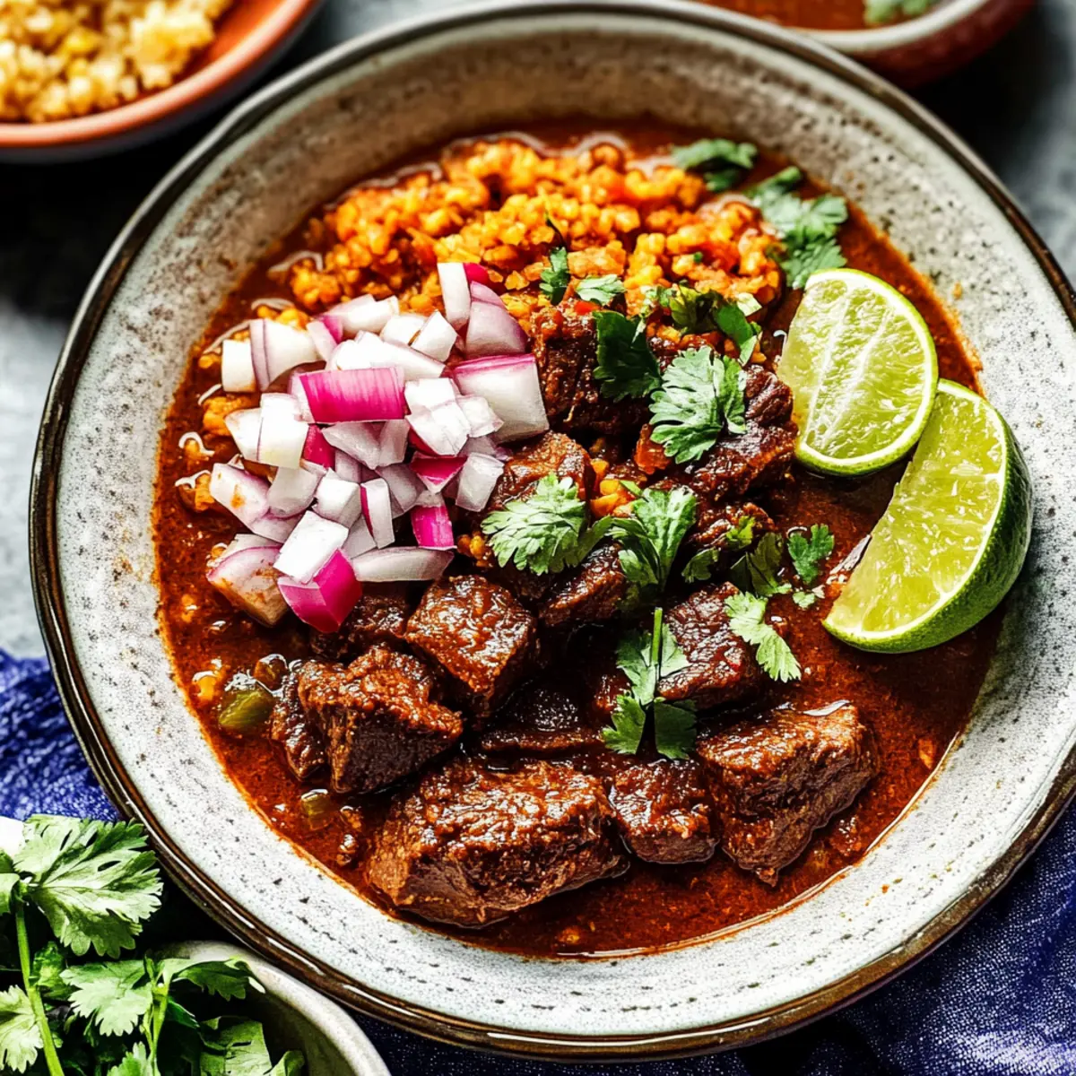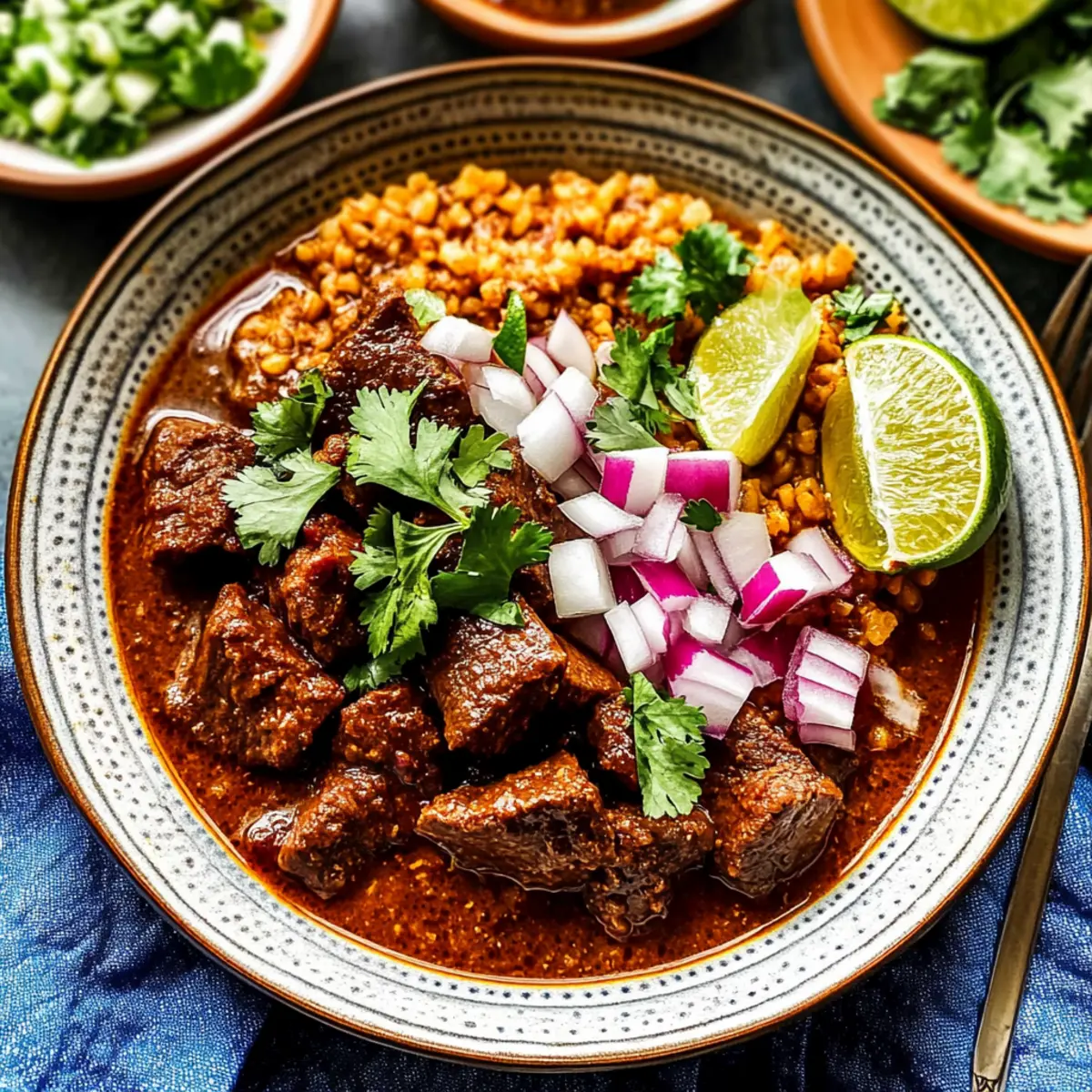 • White Onion, Cilantro, Radishes, Lime Wedges – Fresh toppings that elevate the presentation and flavor of your Beef Chile Colorado!