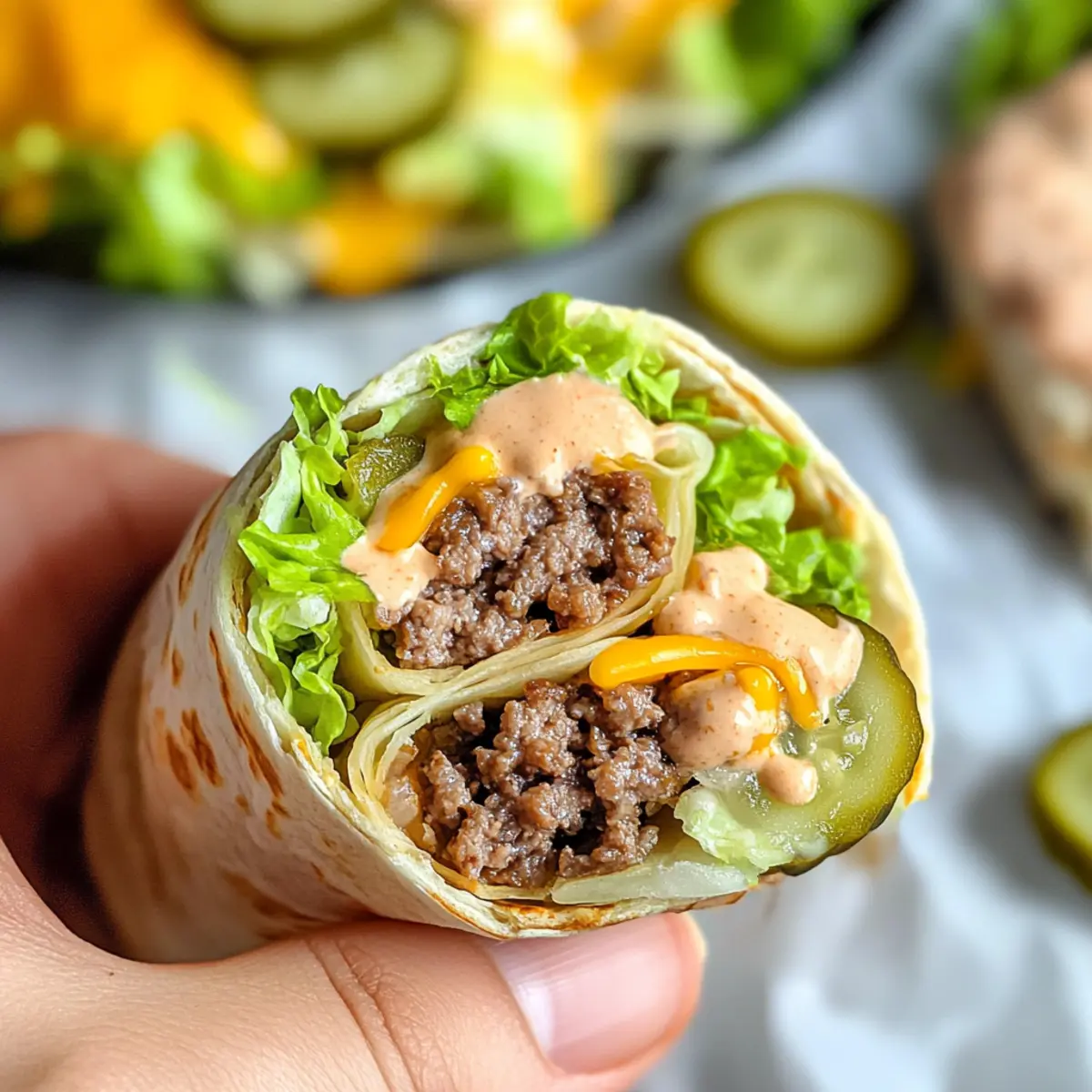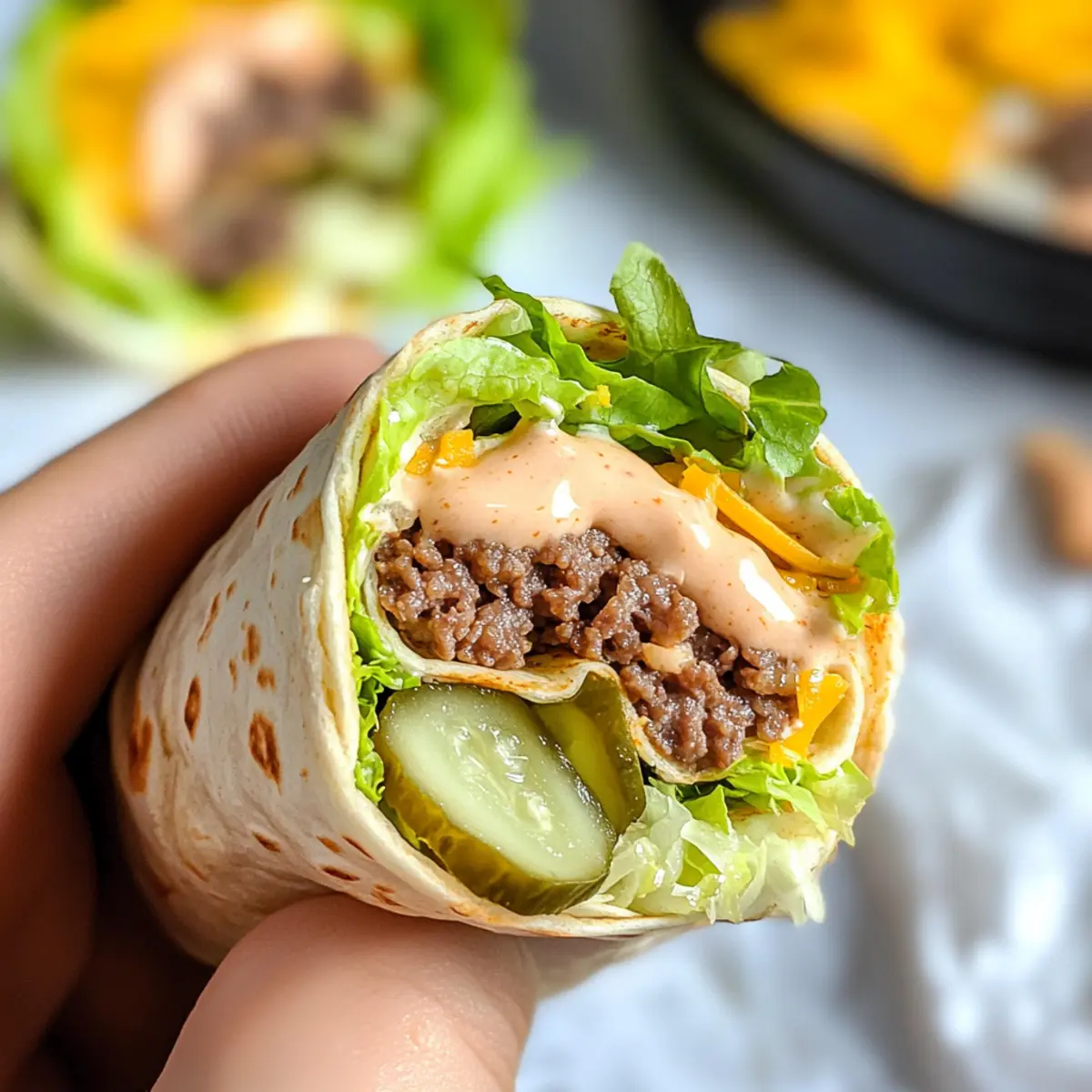 Lay each warm wrap flat on a clean surface. Start by spreading a generous tablespoon of the special sauce evenly over the wrap. Next, add a portion of the cooked ground beef, followed by shredded iceberg lettuce, shredded cheddar cheese, dill pickles, and optional chopped onion. Carefully fold in the sides and roll the wrap tightly, securing the filling inside.
