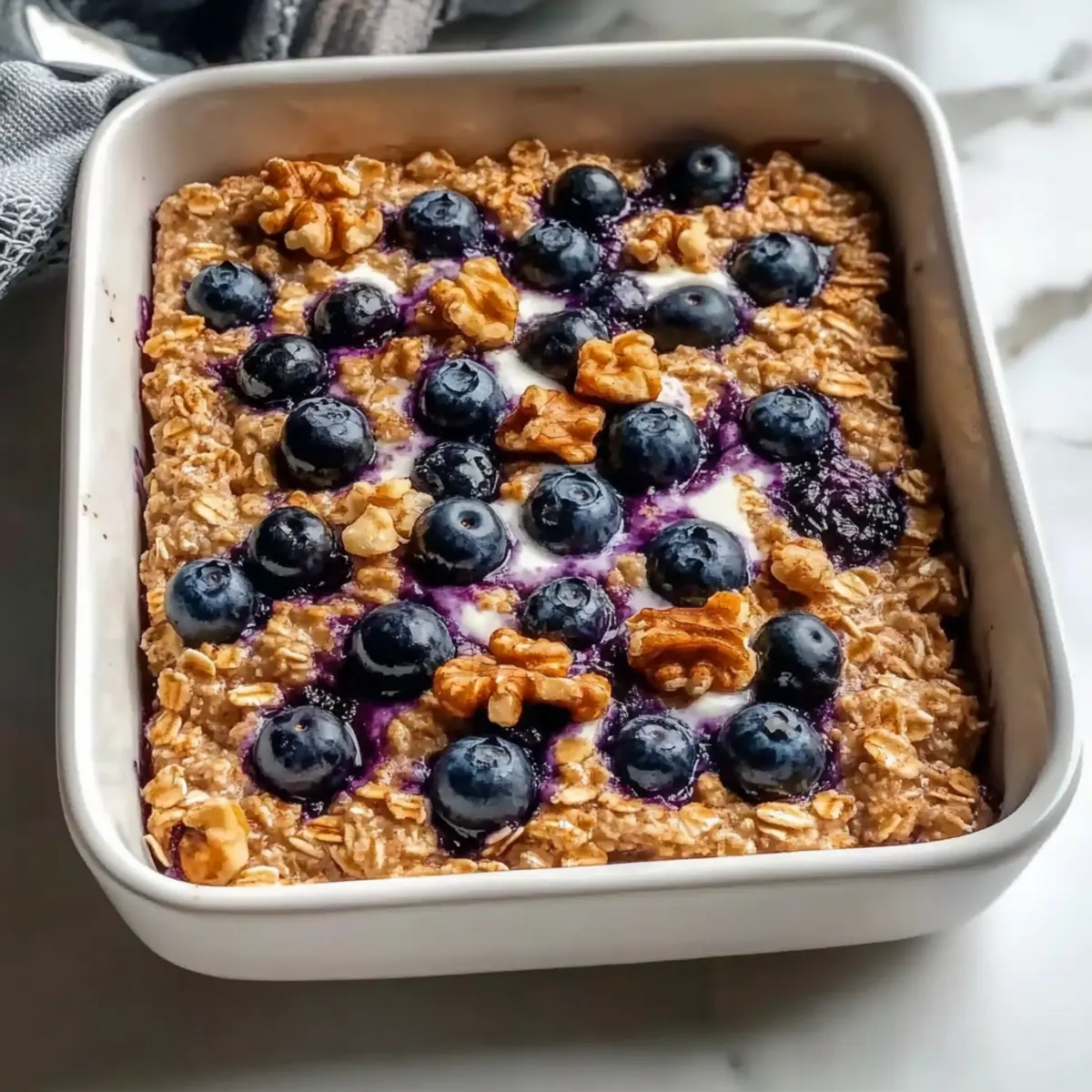 Once baked, remove the Blueberry Baked Oatmeal from the oven and let it cool for 5-10 minutes. This cooling time helps it set further, making it easier to cut into squares. Serve warm, optionally topped with a dollop of Greek yogurt and a drizzle of honey for added indulgence.