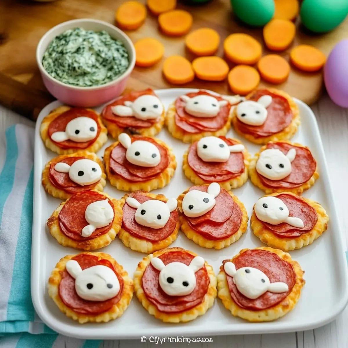 Whimsically Fun: These Bunny Pawprint Mini Pizzas are not only a crowd-pleaser but also a hit with kids, making them perfect for any festive gathering.