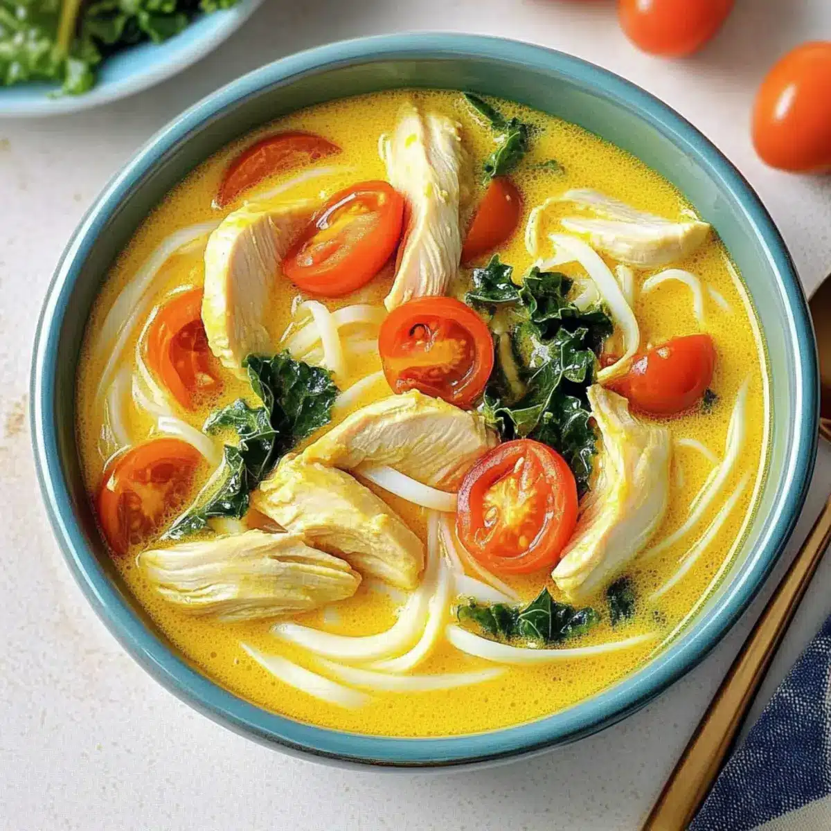 Once the broth has thickened slightly, incorporate the chopped kale and halved cherry tomatoes. These colorful ingredients not only add nutrition but also enhance the visual appeal of your Ceylon Chicken Curry Noodle Soup. Allow the soup to simmer for an additional 6-8 minutes until the kale is tender and vibrant green.