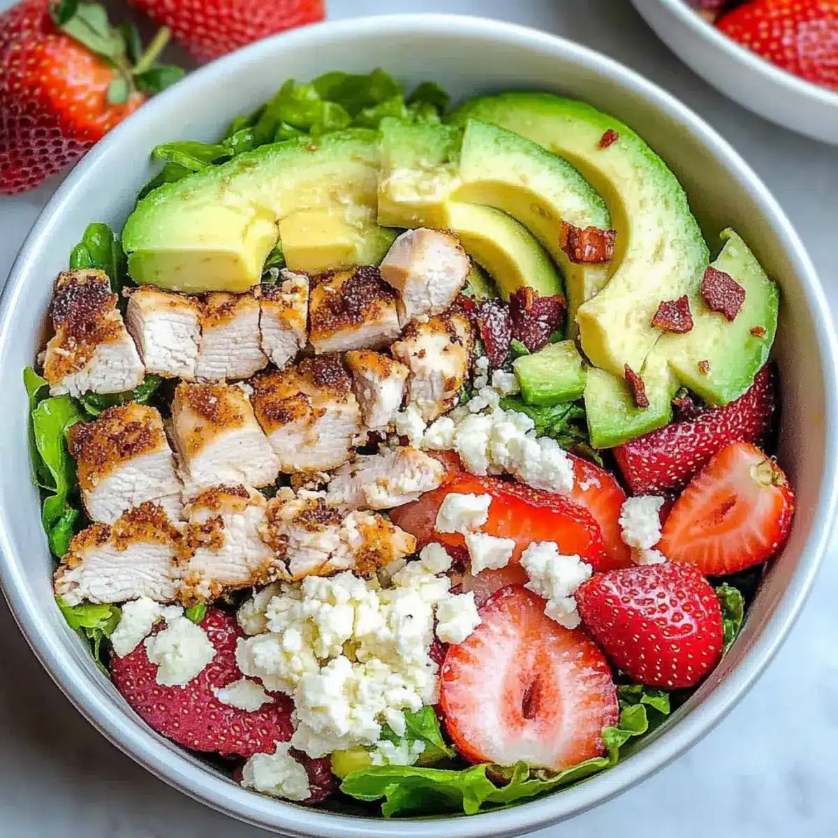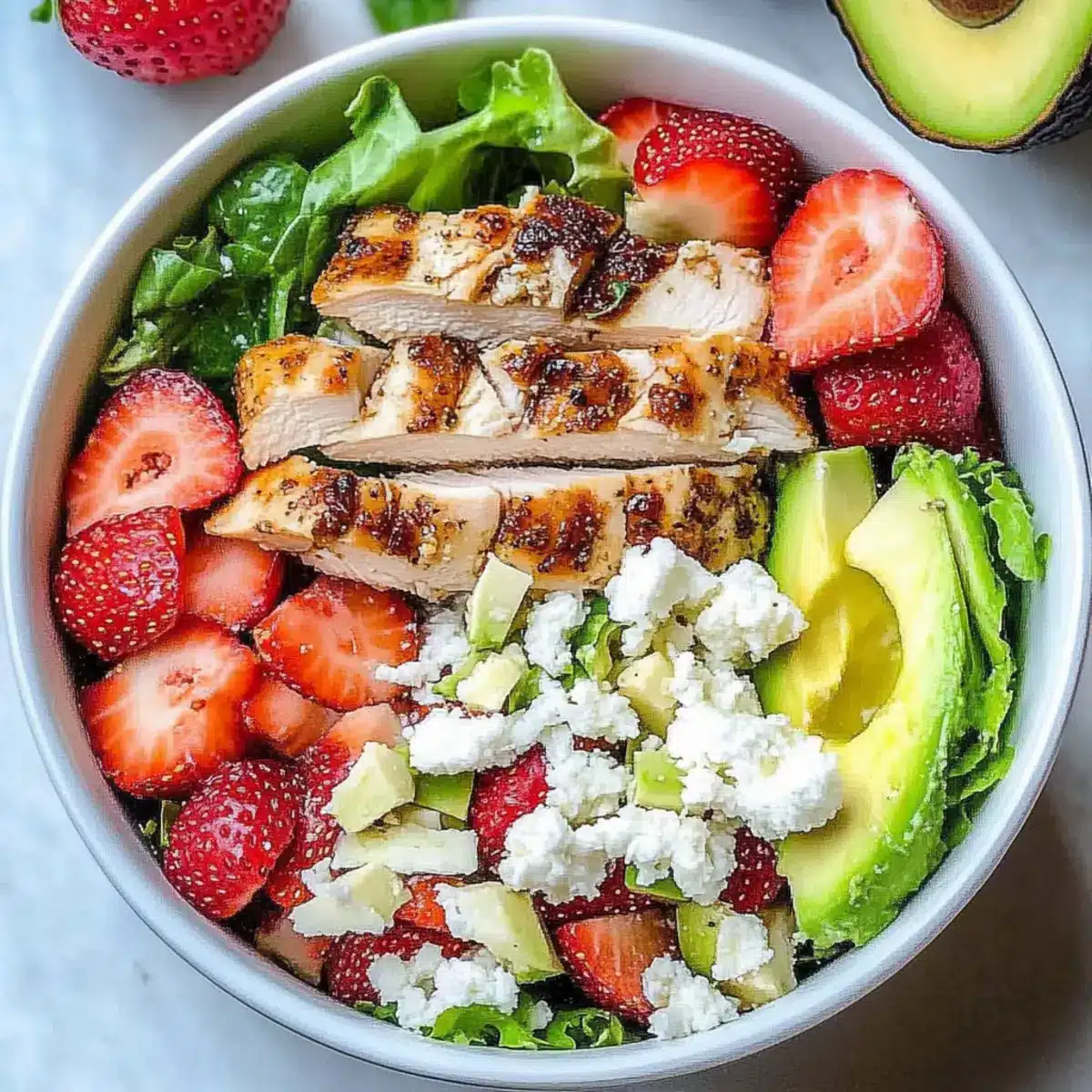 Once the chicken has rested and is cool enough to handle, chop it into bite-sized pieces and layer it atop the salads. Add the crumbled cheese, sliced avocado, and red onion for that extra crunch. To complete your Chicken Strawberry Salad Bowls, simply season with additional salt and pepper, drizzle with olive oil and balsamic vinegar, and toss gently to combine—all ready to enjoy!
