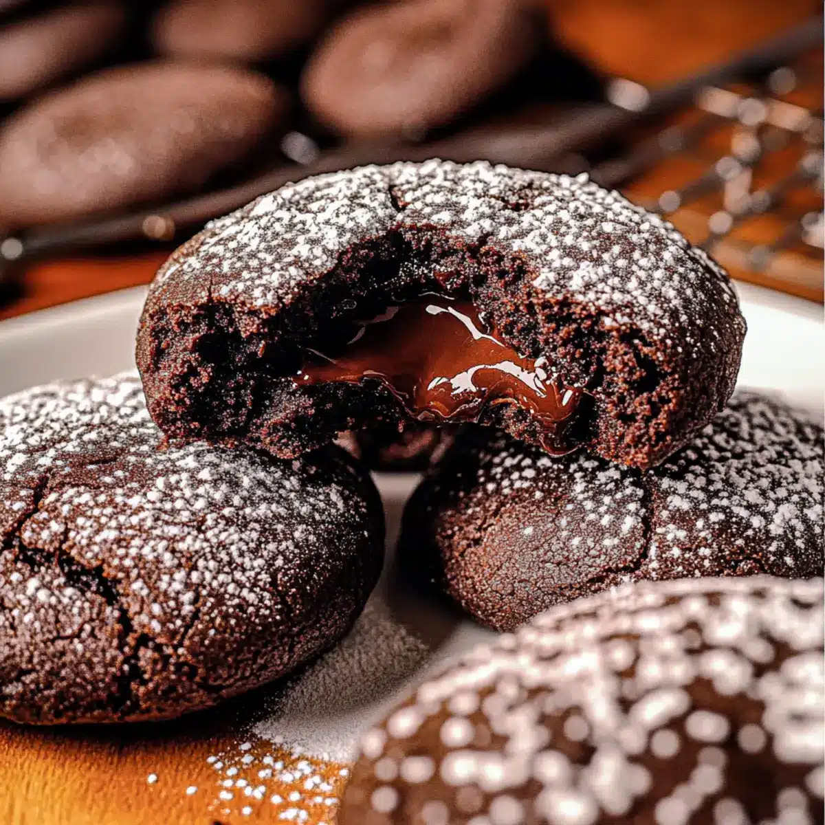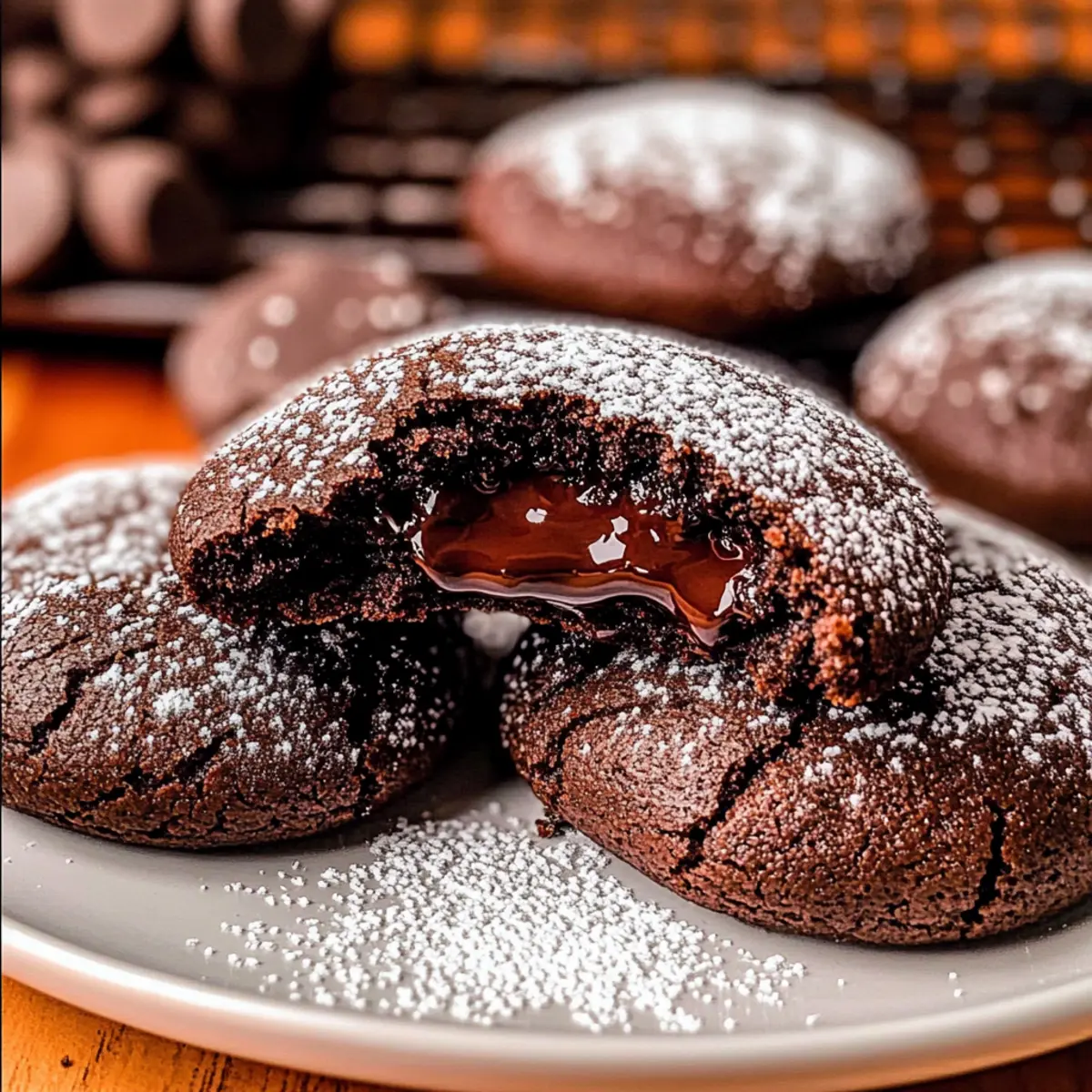Allow the cookies to cool on the baking sheet for 10 minutes after baking to firm up. Then carefully transfer them to a wire rack to cool completely. For a delightful finishing touch, dust the warm cookies with powdered sugar before serving. Enjoy these amazing Chocolate Lava Cookies with a scoop of ice cream or a glass of milk!