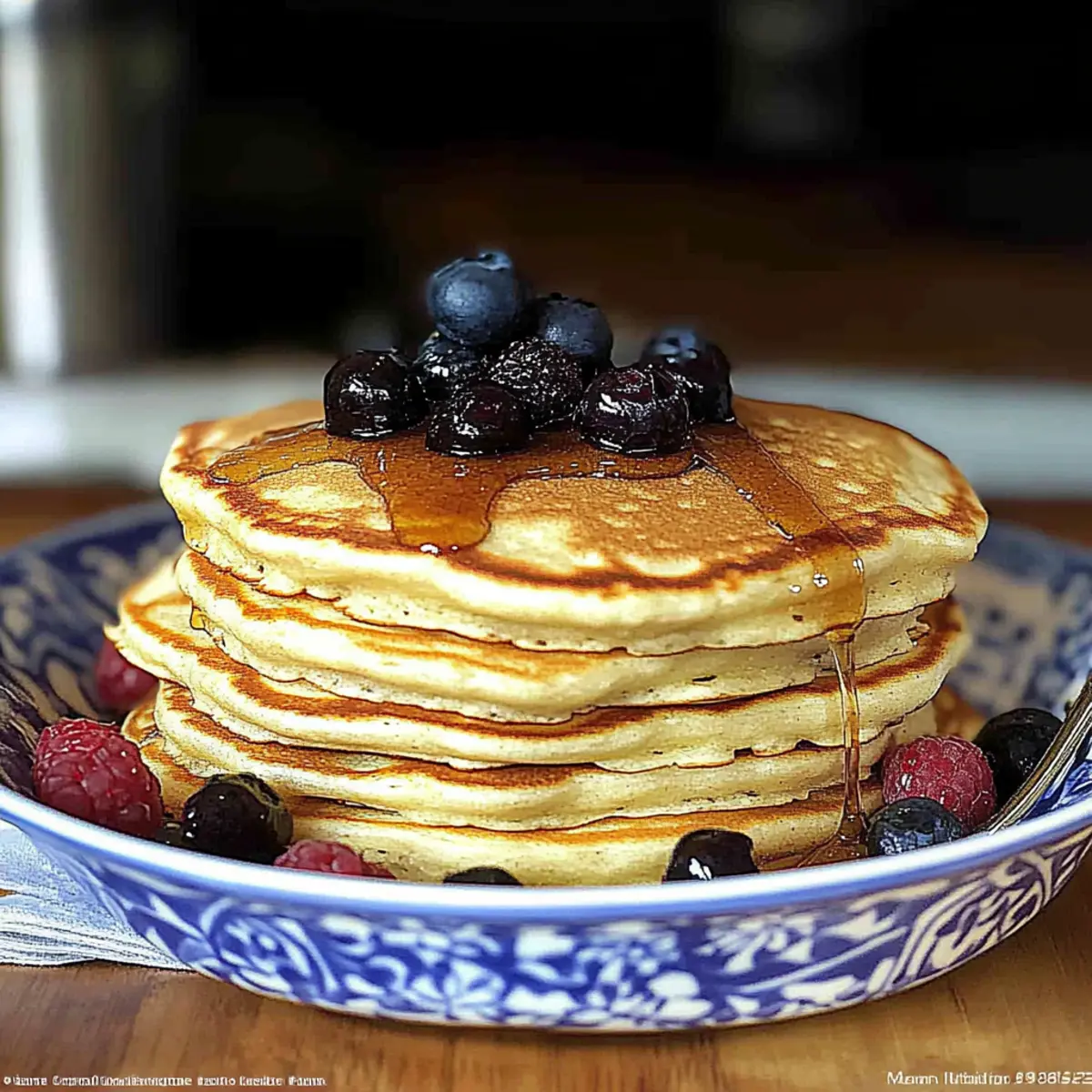 - Serve pancakes warm topped with butter, syrup, or fresh berries.