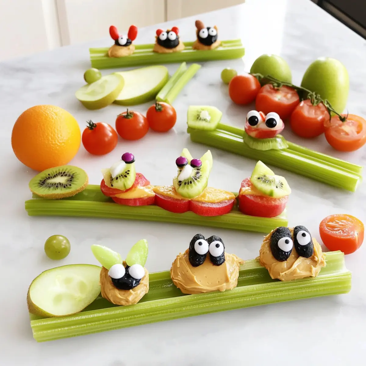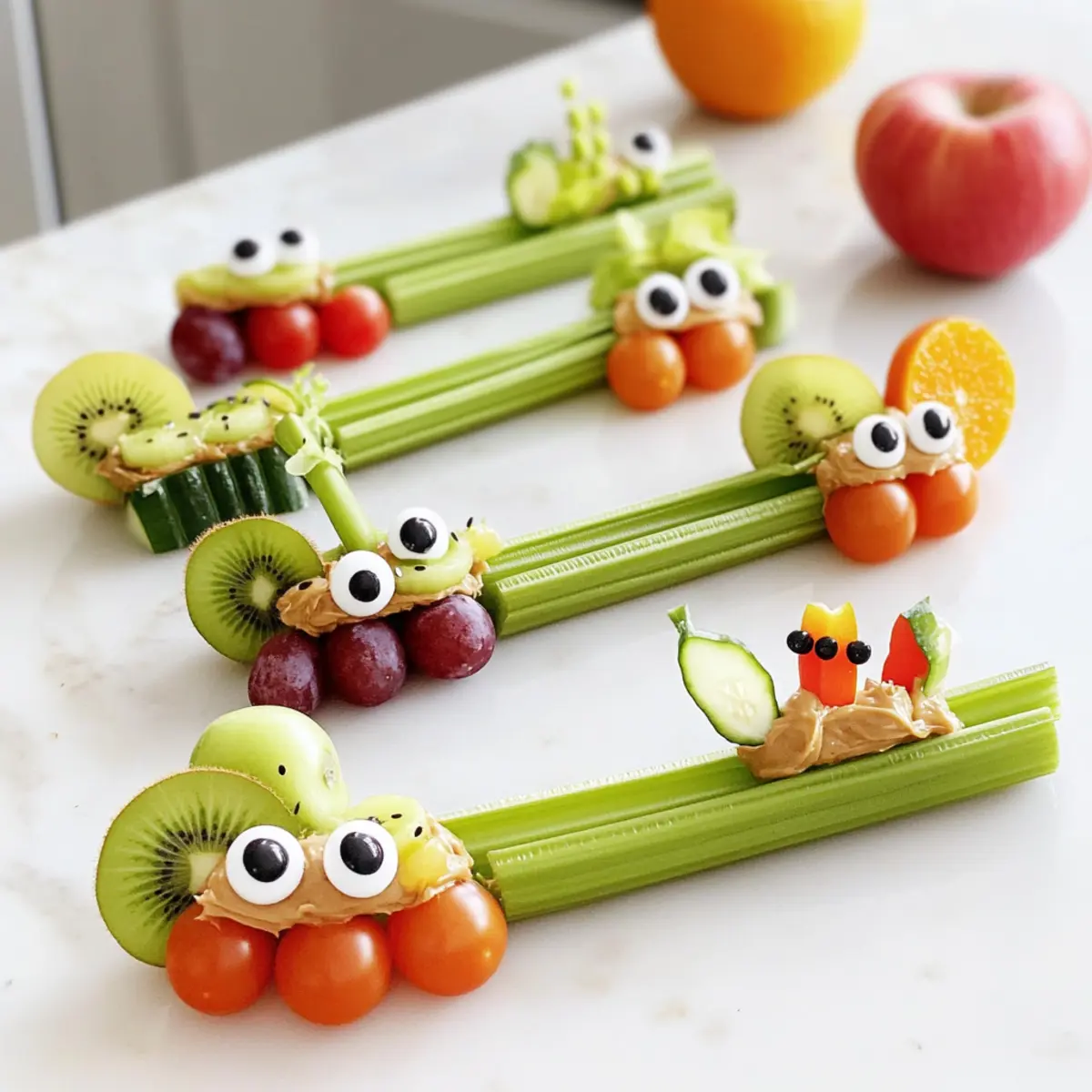 These Critter Crudités are a fantastic option for meal prep, allowing you to save time and enjoy a playful snack when you need it most! You can prepare the celery stalks up to 24 hours in advance; simply rinse, dry, and cut them into bite-sized pieces. Store the cut celery in an airtight container with a damp paper towel to keep it crisp. Additionally, slice your fruits and veggies (like apple, kiwi, and cucumber) the night before and refrigerate them in separate containers. When you’re ready to serve, just spread the peanut butter or cream cheese inside the celery stalks, add your toppings, and voila—delicious and fun snacking is ready in a flash!