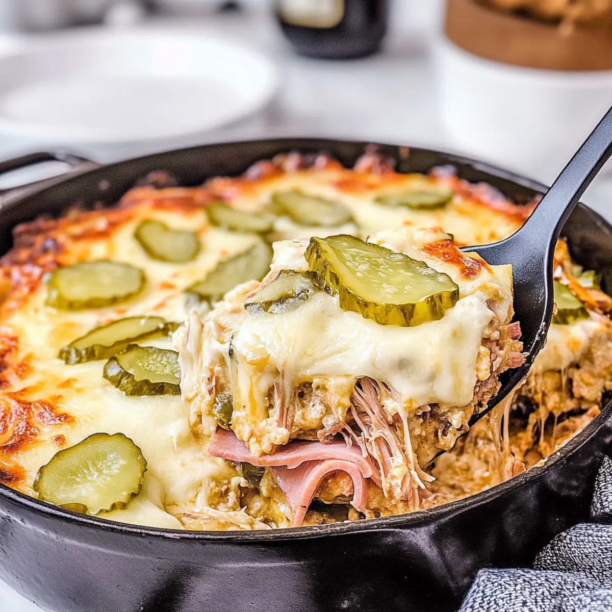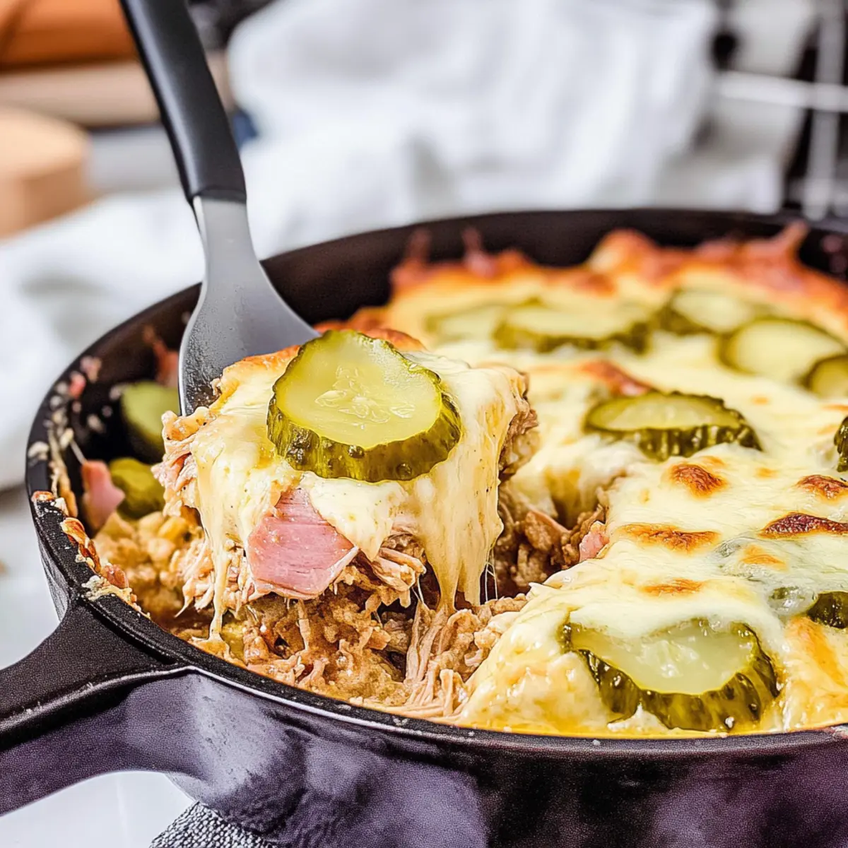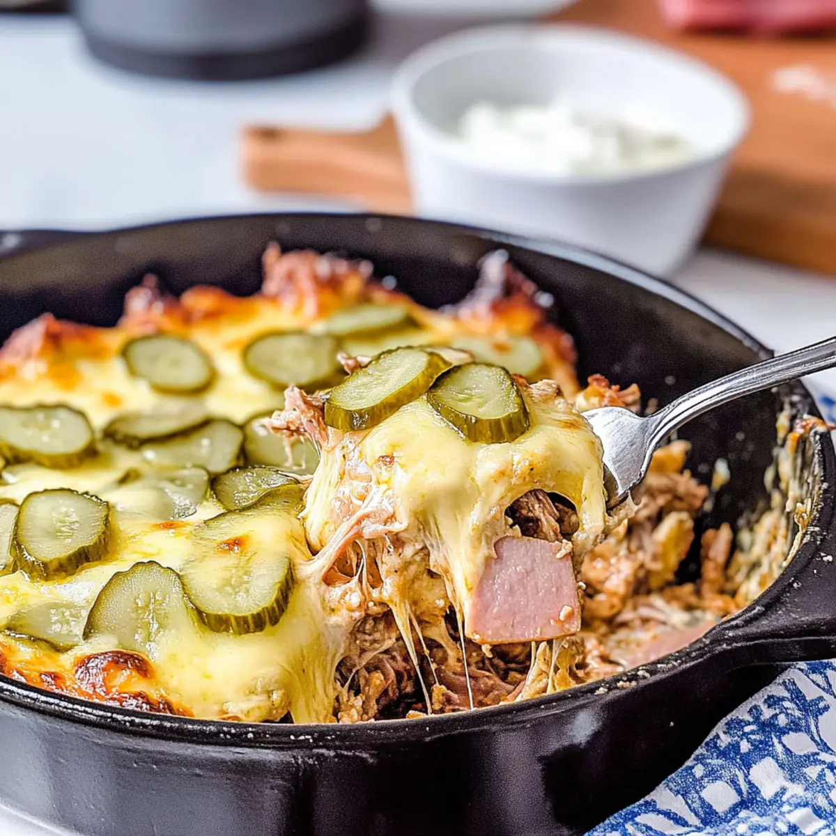 Once baked, remove the skillet from the oven and let it cool for a few minutes. As an optional touch, garnish with additional pickles for a fresh burst of flavor. This step not only enhances the presentation but also adds that extra zesty pop that perfectly complements this rich casserole.