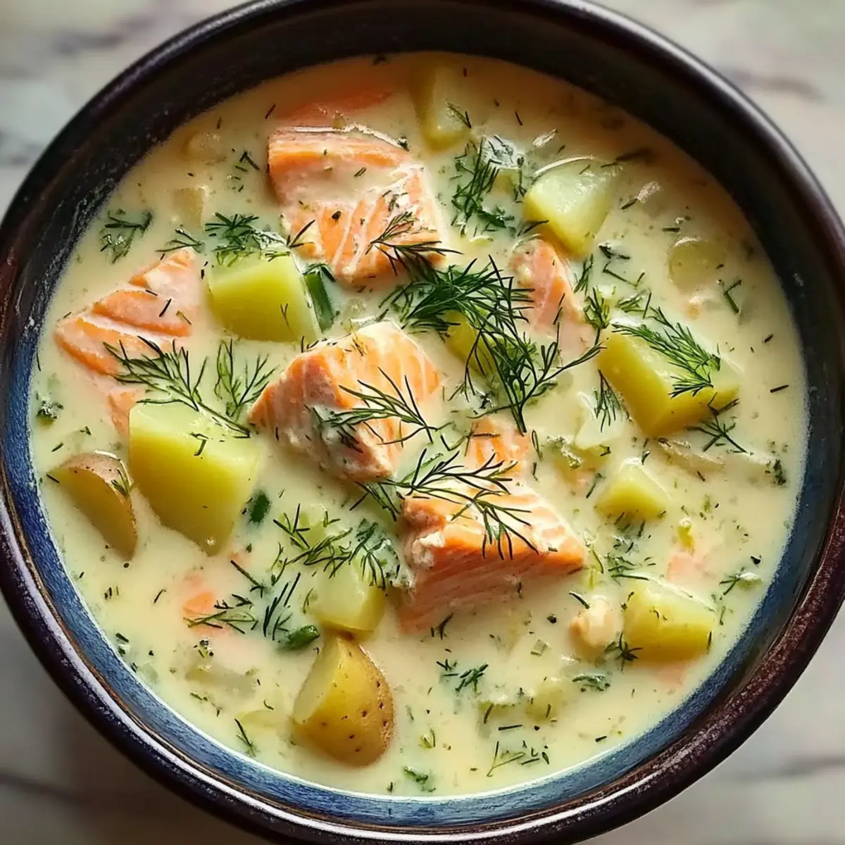 Comforting Warmth: This Creamy Dill Salmon Soup soothes the soul with its velvety texture and wholesome ingredients.