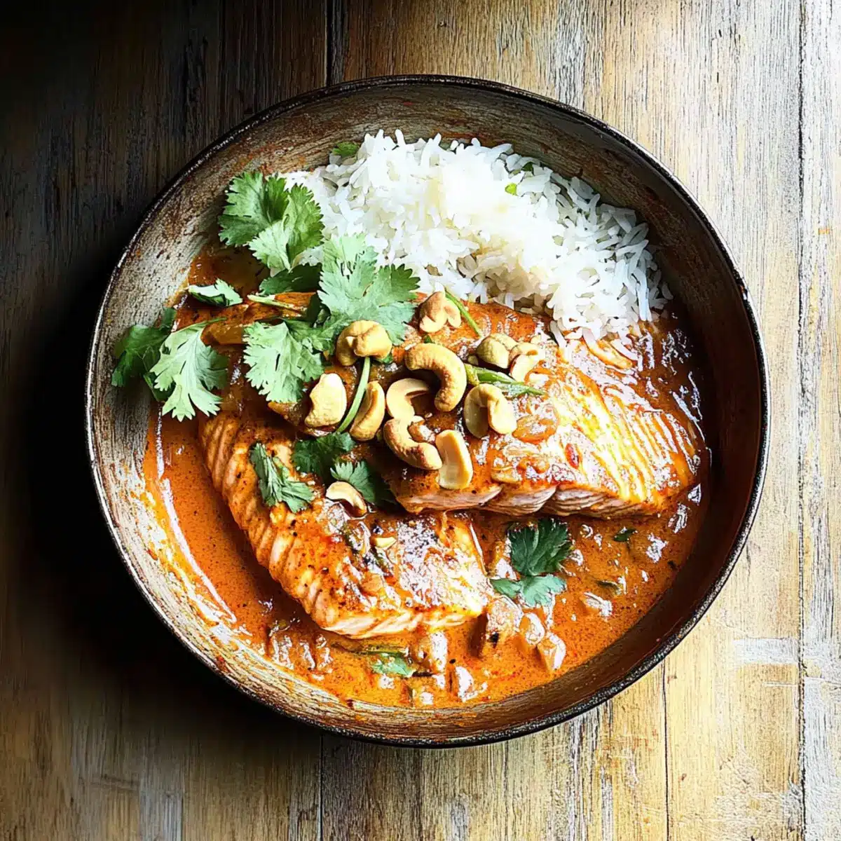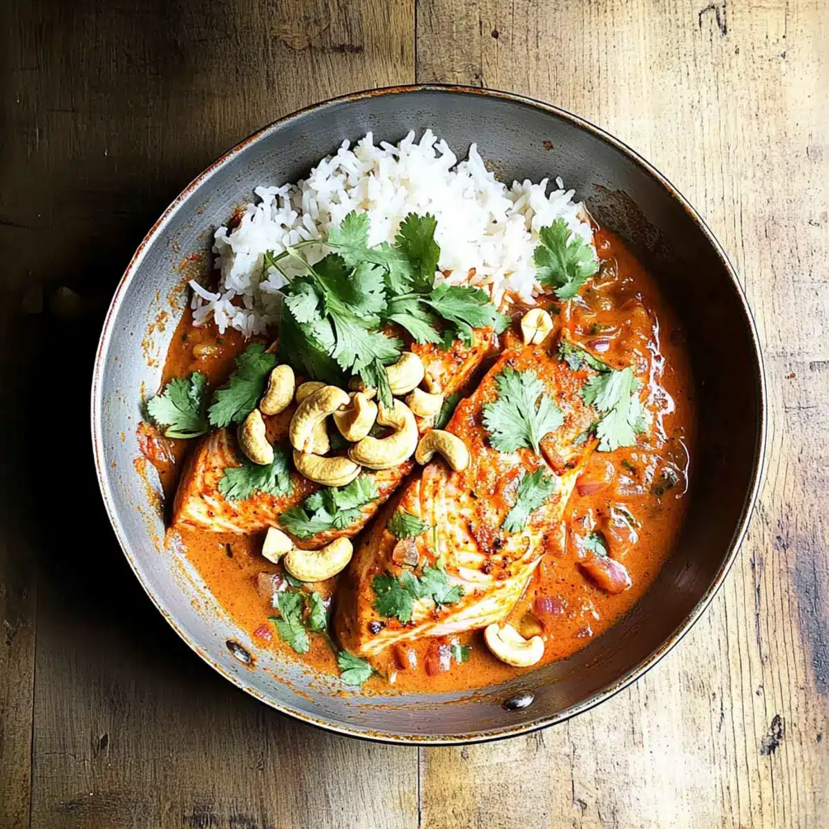 Once the salmon is done, remove the skillet from heat. Top the dish with crushed chili flakes for added heat, if desired. Garnish your Easy Butter Salmon Curry with toasted cashews and chopped cilantro. Serve with your choice of rice or naan for a complete meal, and enjoy the delightful flavors!