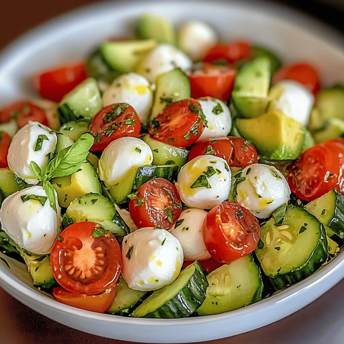 - In a large serving bowl, artfully arrange the cucumber slices, halved cherry tomatoes, mozzarella balls, and diced avocado. Tear the fresh basil leaves into smaller pieces and scatter them on top.