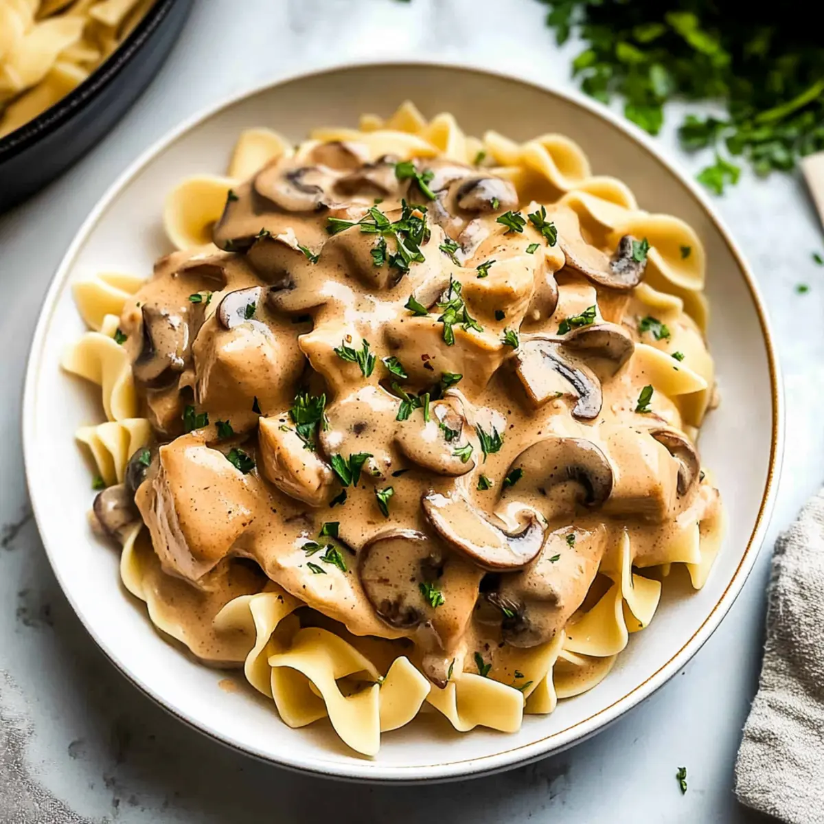 - Serve the creamy stroganoff over cooked egg noodles or rice, garnished with fresh parsley.