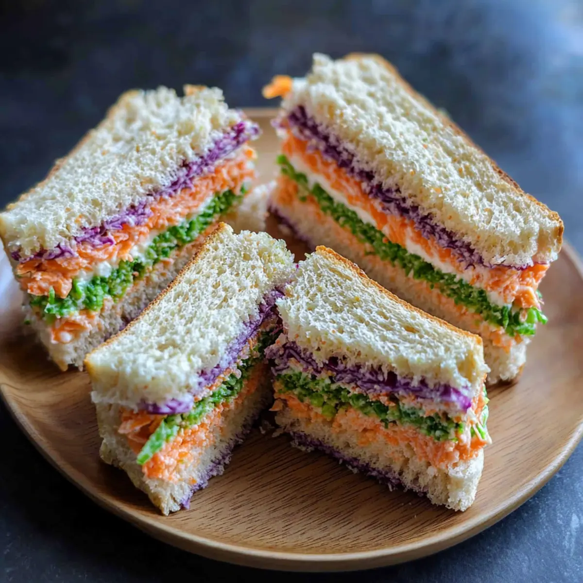 These Easy Tea Party Sandwiches are perfect for meal prep enthusiasts! You can prepare the filling (strained yogurt, carrots, and purple cabbage) up to 24 hours in advance, storing it in an airtight container in the refrigerator to maintain freshness. The yogurt should be strained overnight for the best texture, while the chopped veggies can also be prepped ahead, ensuring they’re ready to mix when you’re assembling. When it’s time to serve, simply spread the avocado cilantro dressing or green chutney on the bread, add the delicious filling, and slice the sandwiches. With these make-ahead tips, you’ll save time and still enjoy flavorful, fresh sandwiches!