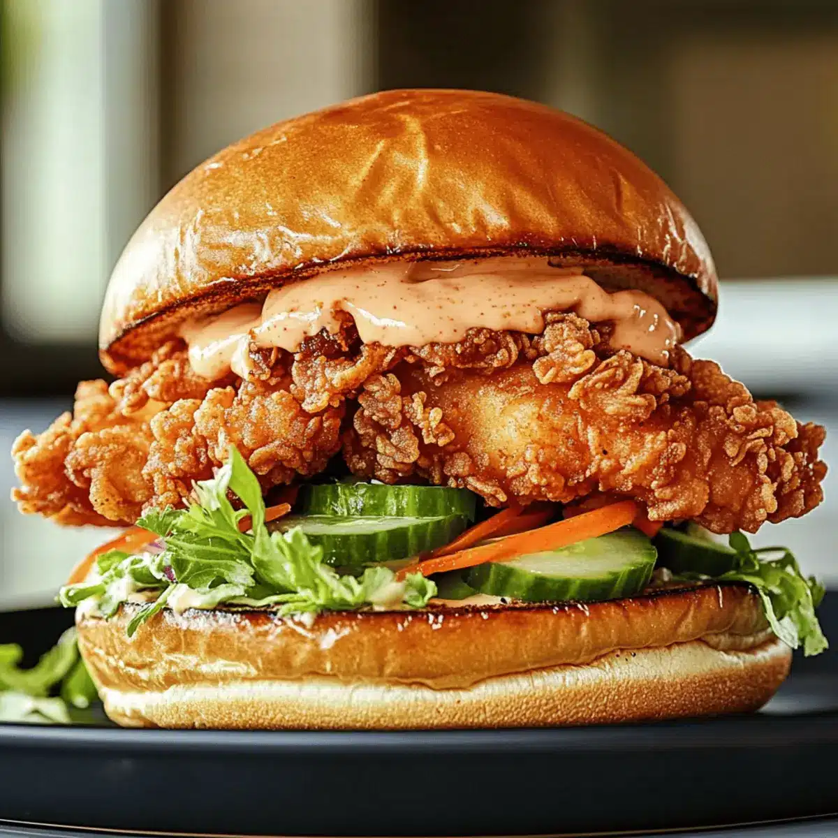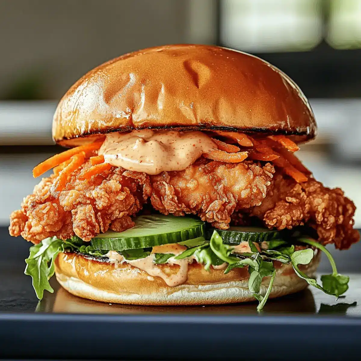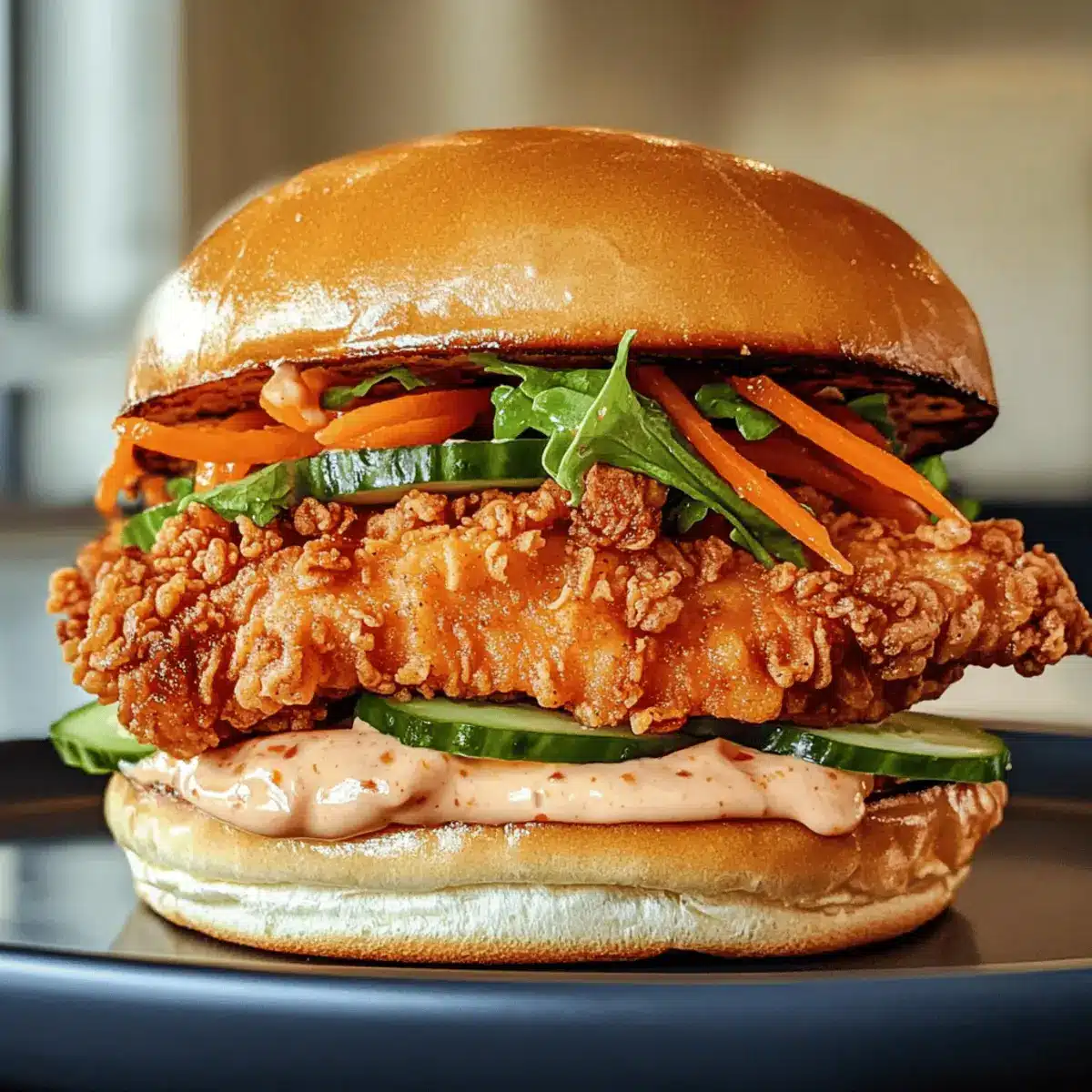 Toast the brioche or sandwich buns until golden brown for an added crunch. Generously spread the chili mayo on both sides of each bun, creating a flavorful base for your sandwich. Layer the fried chicken on the bottom half, followed by crunchy cucumbers, pickled carrots, and a handful of fresh herbs like cilantro or mint. Top with the other half of the bun, pressing gently to secure everything in place.