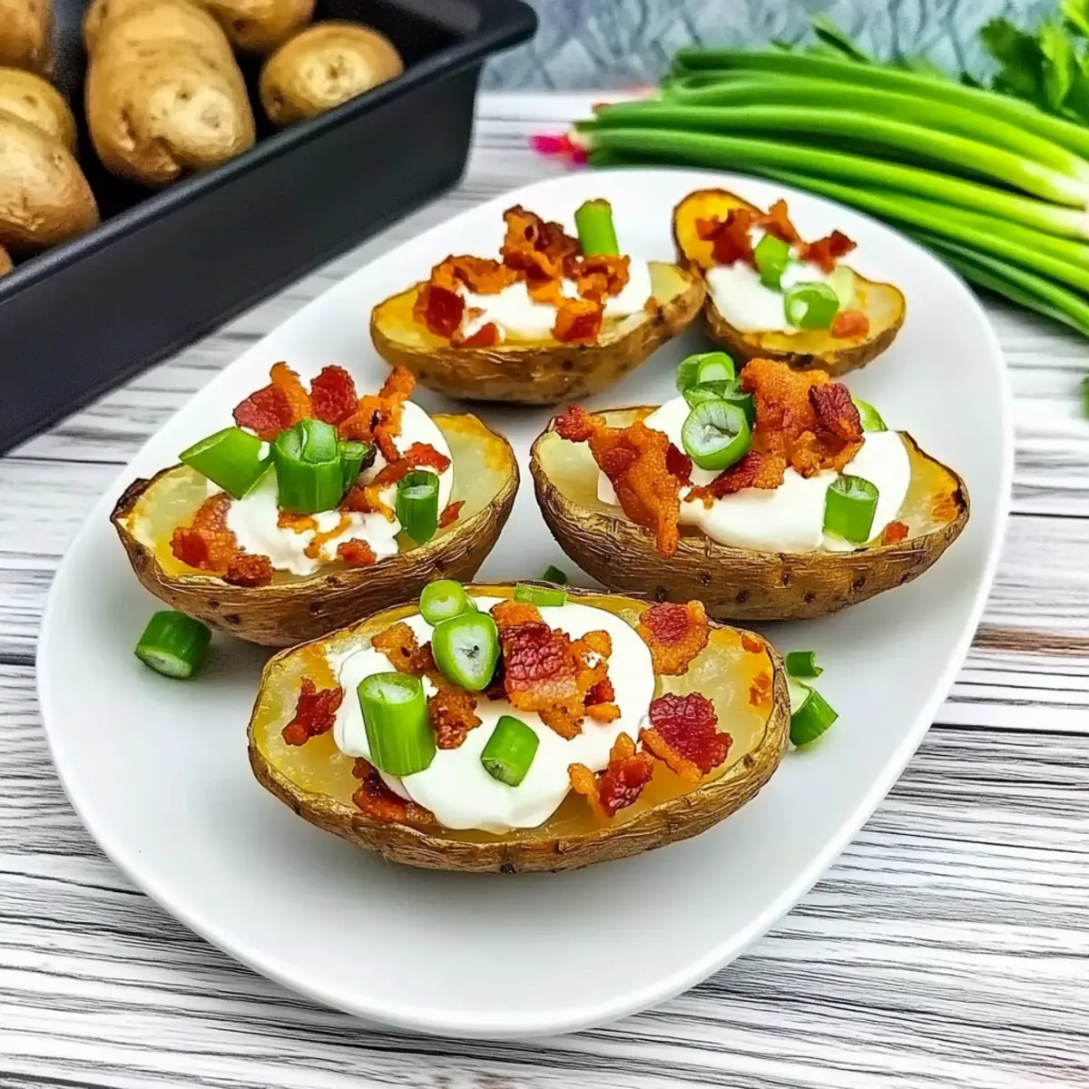 - Top each potato skin with green onions and sour cream, then serve warm.