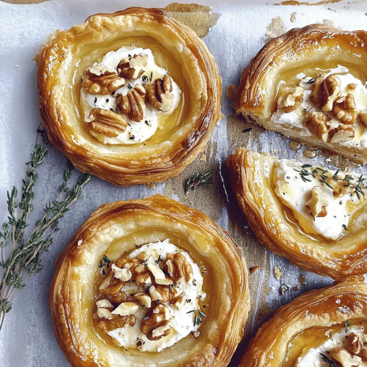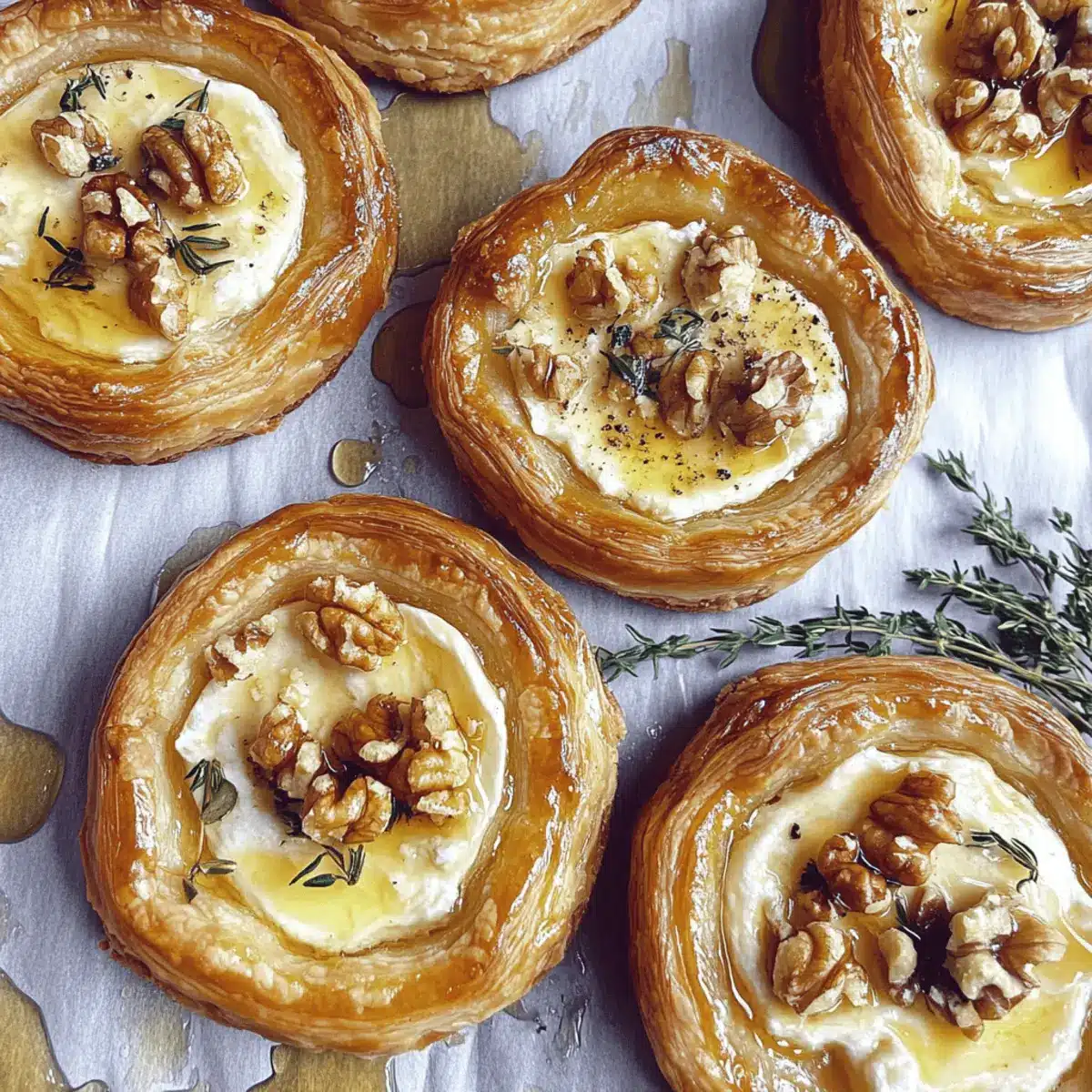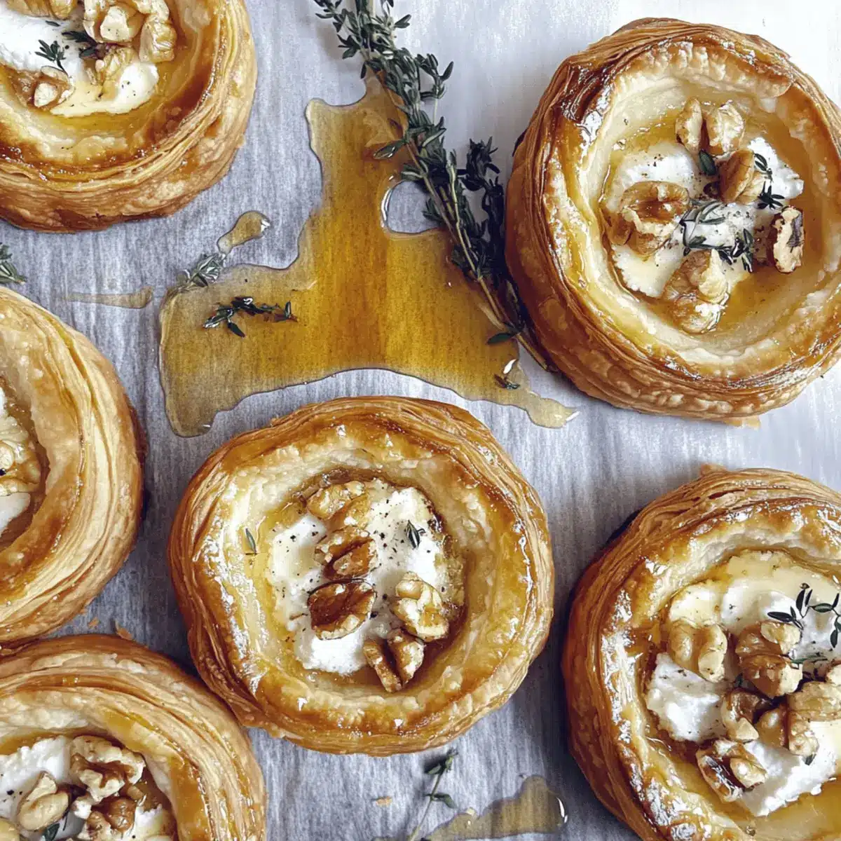 Once your Goat Cheese and Walnut Tarts are out of the oven, let them cool for a few minutes. To finish, artfully arrange fresh thyme sprigs on top and drizzle with a touch more honey. This simple garnish adds a pop of color and freshness, elevating your tarts into a truly elegant appetizer ready to impress your guests.