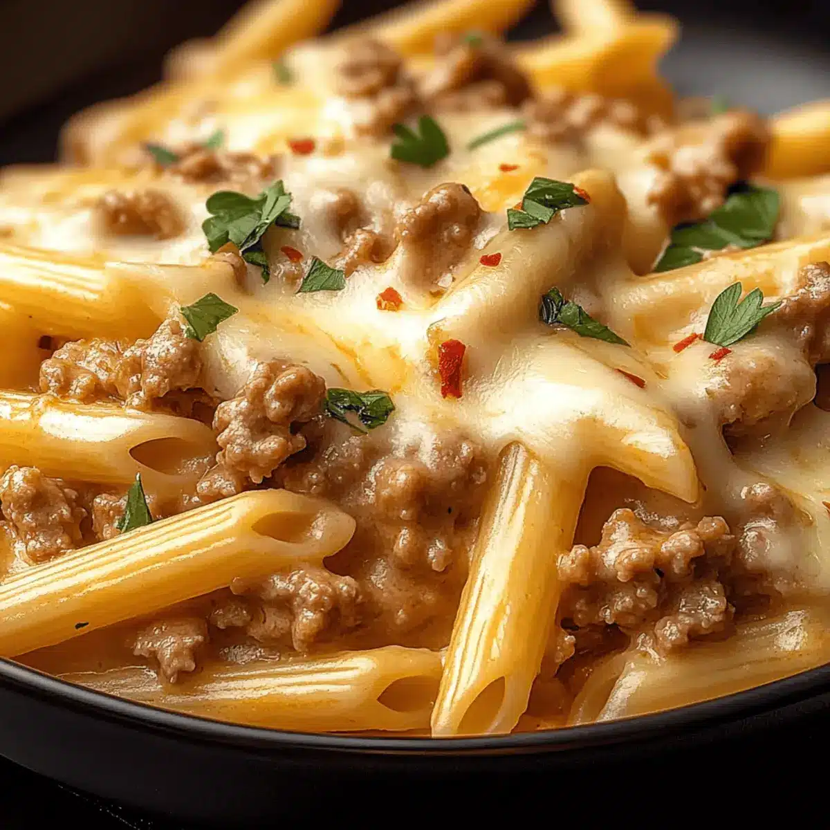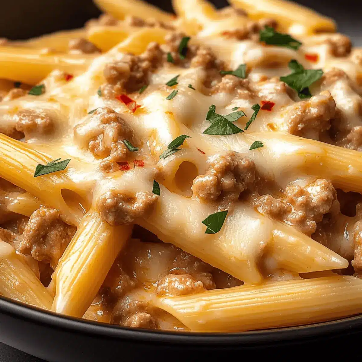 Once the cheese is gooey and melted, remove the skillet from heat. Garnish the pasta with freshly chopped parsley and a sprinkle of red chili flakes for those who enjoy a little heat. Serve the pasta warm in generous portions, ready to be enjoyed by your family or guests.