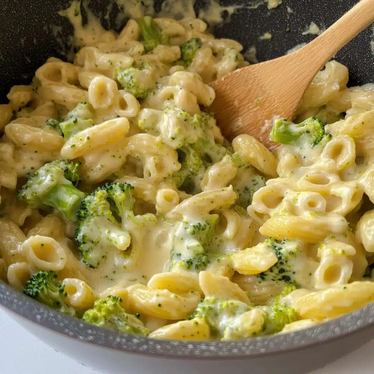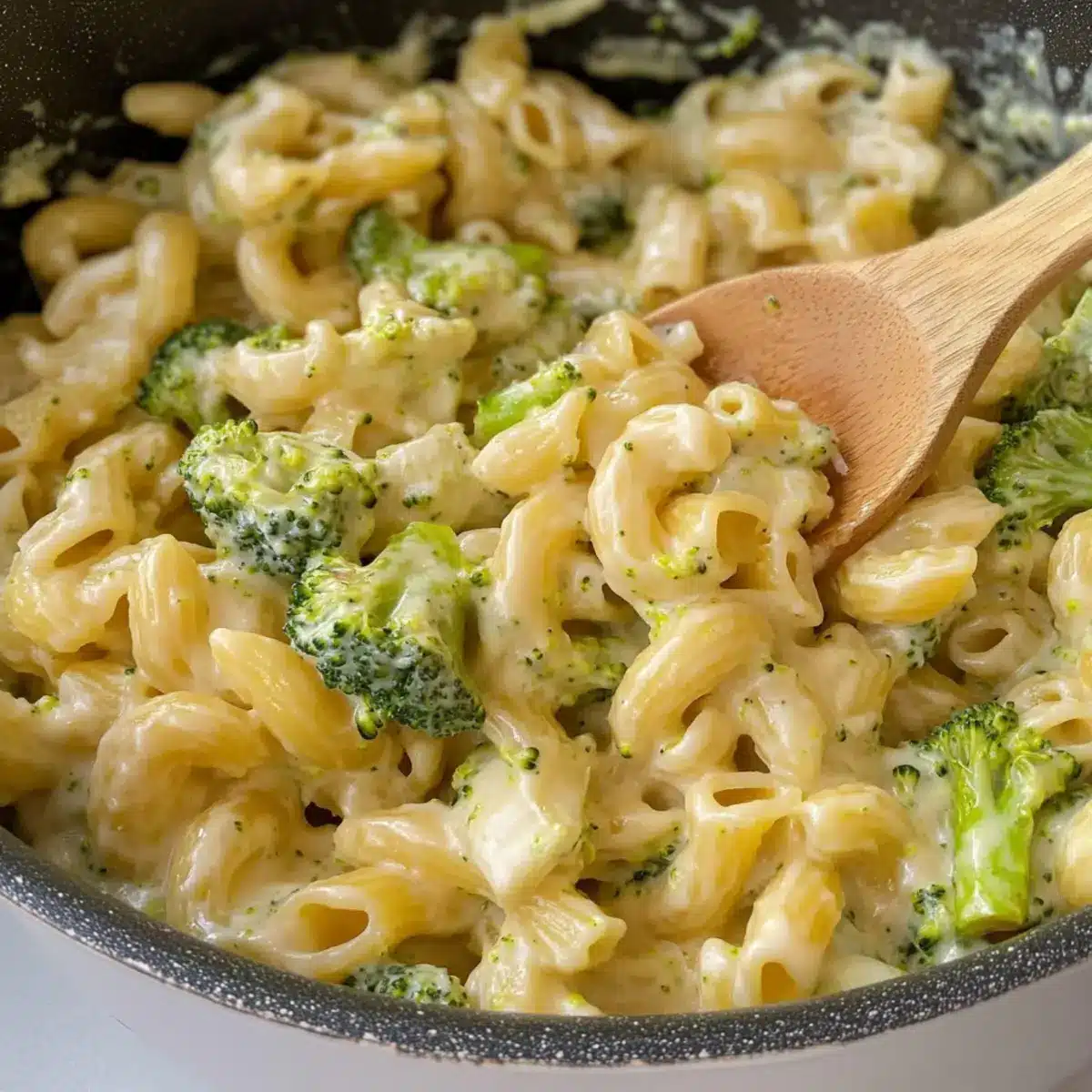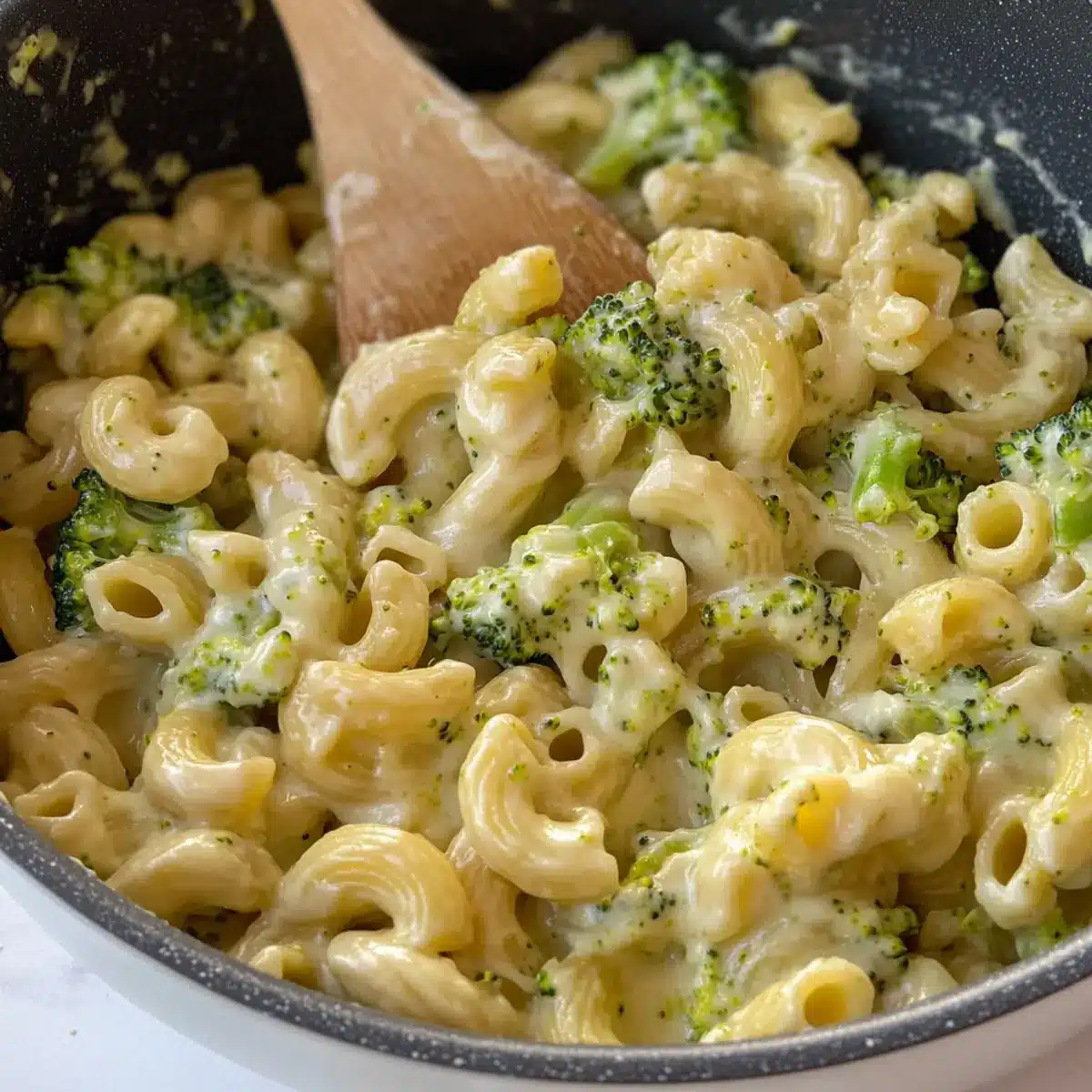 - Mix thoroughly until the pasta and broccoli are coated. If too thick, add more milk to adjust consistency.