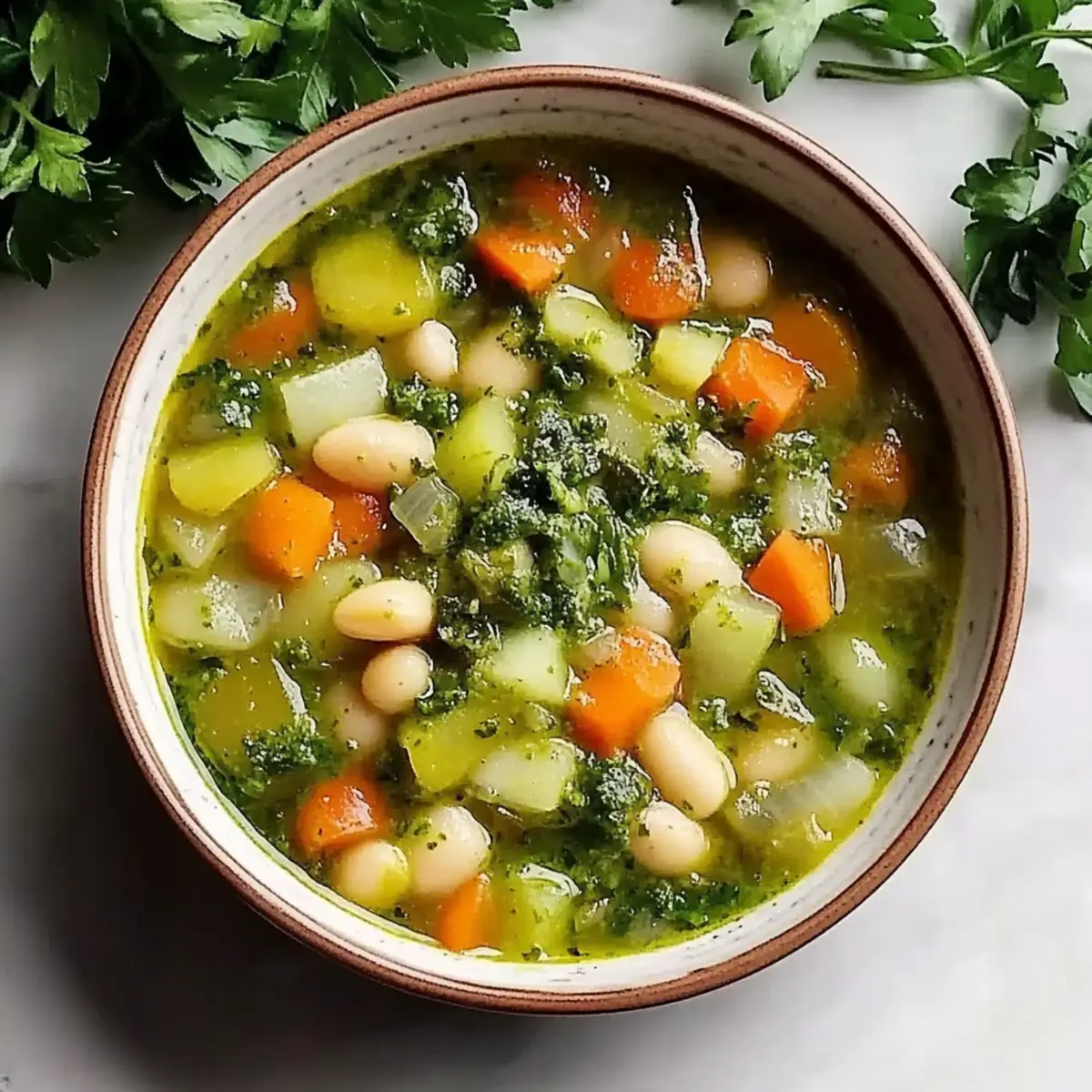 Serve your comforting Italian Green Minestrone di Verdure hot, ladling generous portions into bowls. Top each serving with a dollop of the freshly made basil pesto and a sprinkle of chopped parsley for a bright finish. Enjoy this heartwarming meal with crusty bread for a complete experience!