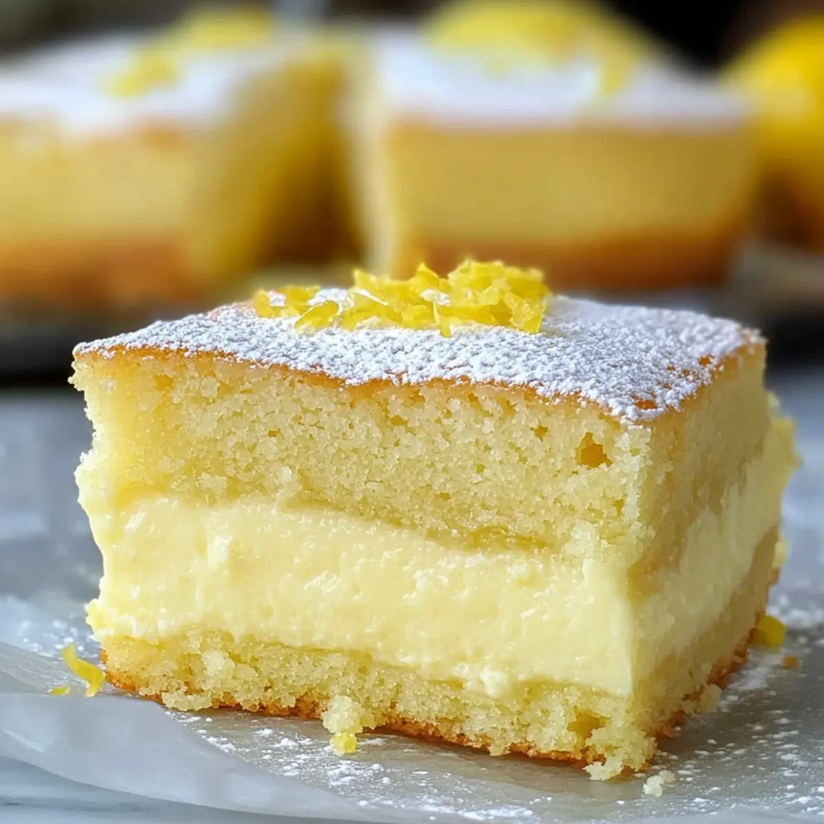 Once baked, remove the cake from the oven and let it cool completely in the pan on a wire rack. This cooling step allows the custard to set perfectly. Once cooled, dust with powdered sugar before serving. Enjoy your refreshing Lemon Custard Cake, and appreciate the delightful flavors you’ve created!