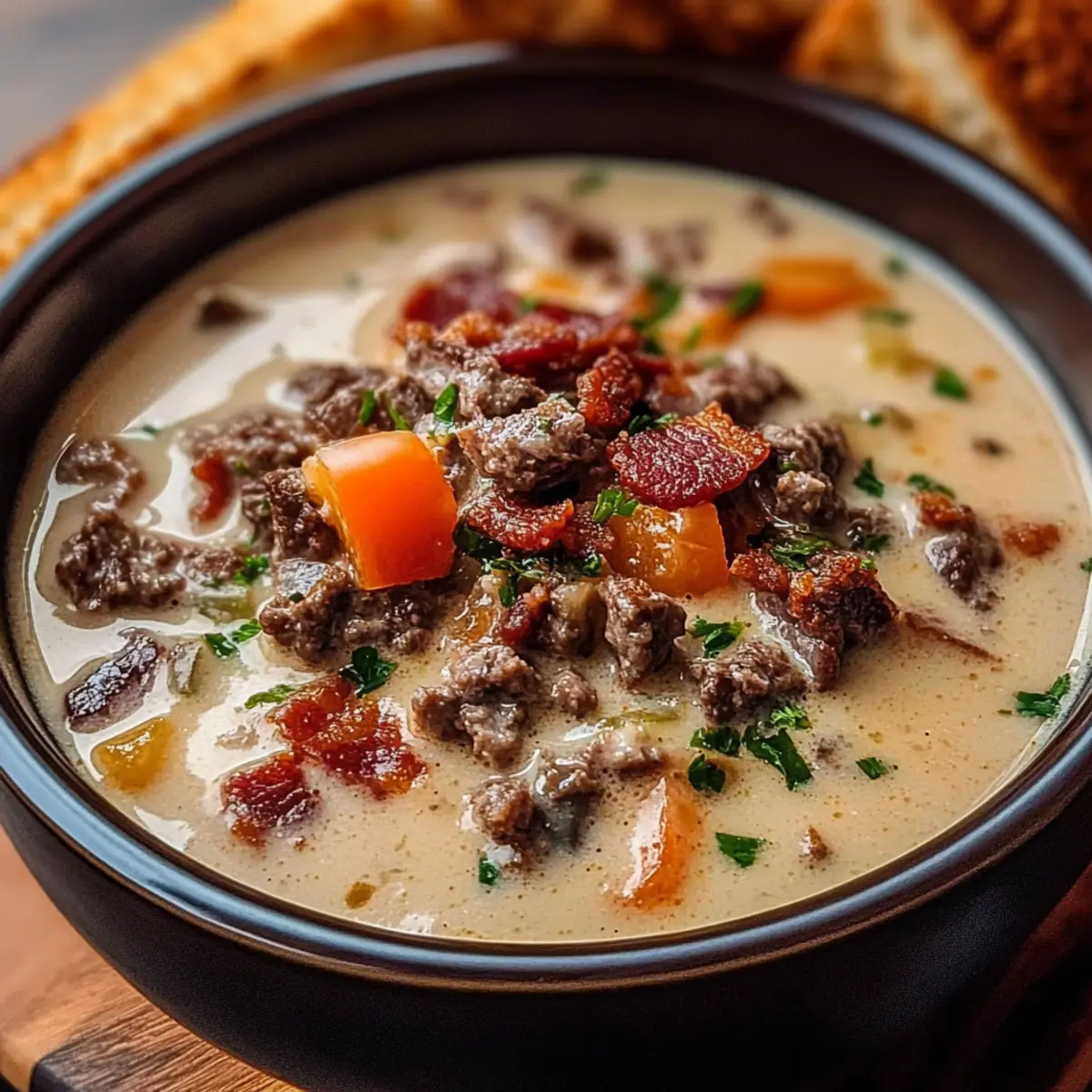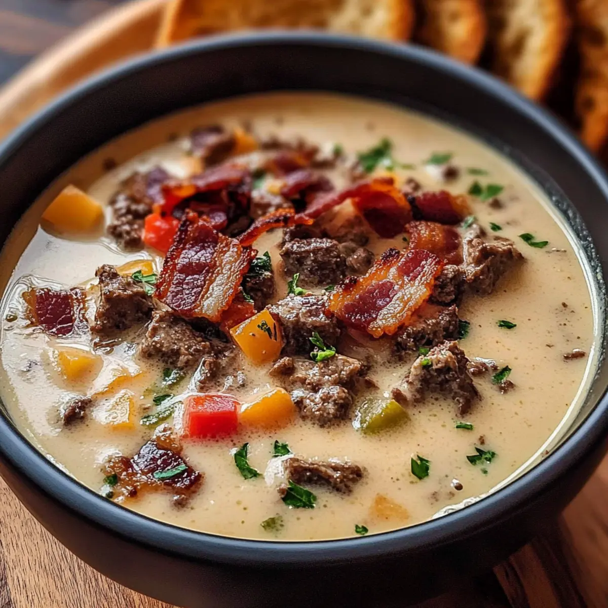 One-Pot Philly Cheesesteak Soup with Bacon and Cheesy Toast Magic