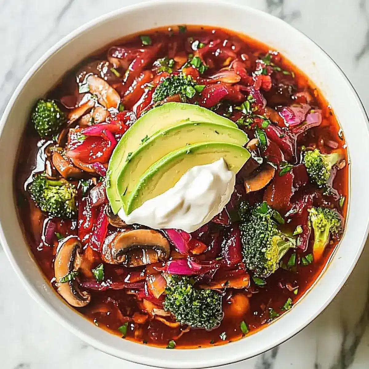 Once the borscht is ready, ladle it into bowls for serving. Top each bowl with creamy avocado slices and a sprinkle of fresh herbs like parsley or chives. This comforting Plant-Based Borscht is not just beautiful; it’s a delightful mixture of flavors and textures that promises to warm you from the inside out!
