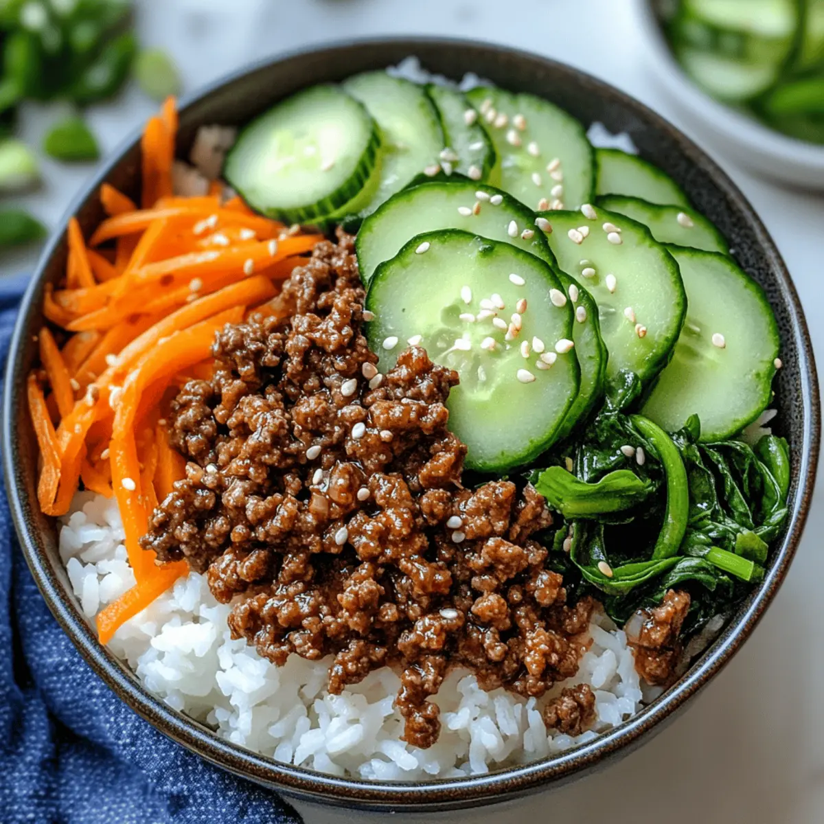 To finish, arrange your selected toppings of sliced cucumbers, shredded carrots, and briefly sautéed spinach on top of the beef and rice. The fresh vegetables will add a delightful crunch and vibrant color to your bowl, lifting the overall presentation and enhancing the nutrition of this speedy meal, giving it that homemade touch.