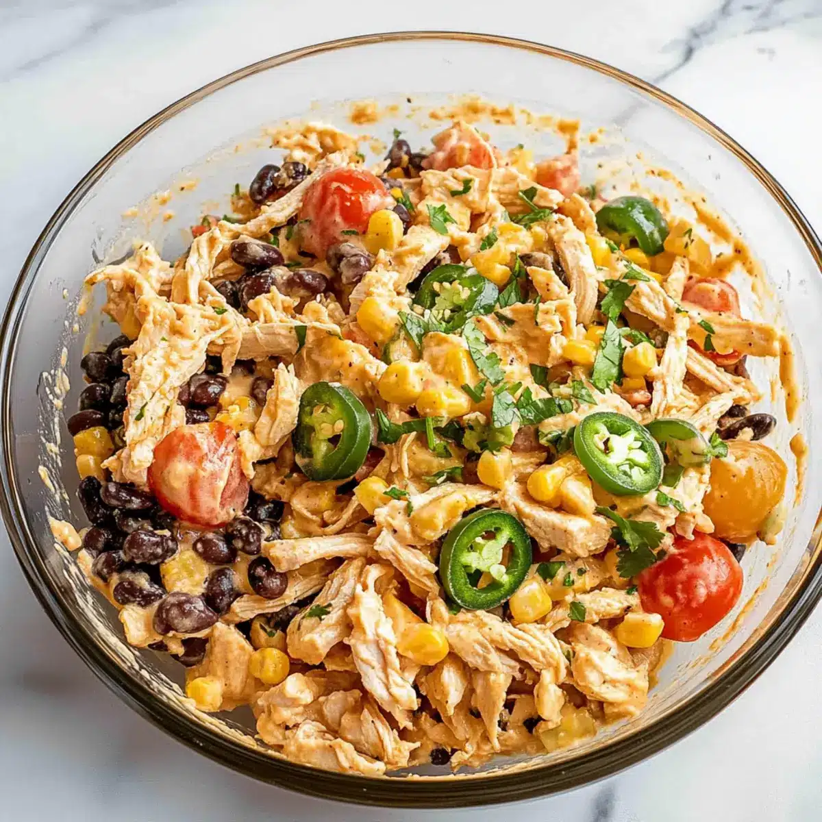 - In a large mixing bowl, combine the cooked shredded chicken, drained black beans, sweet corn, chopped jalapeños, quartered cherry tomatoes, diced red onion, and pepitas. Toss gently to mix.