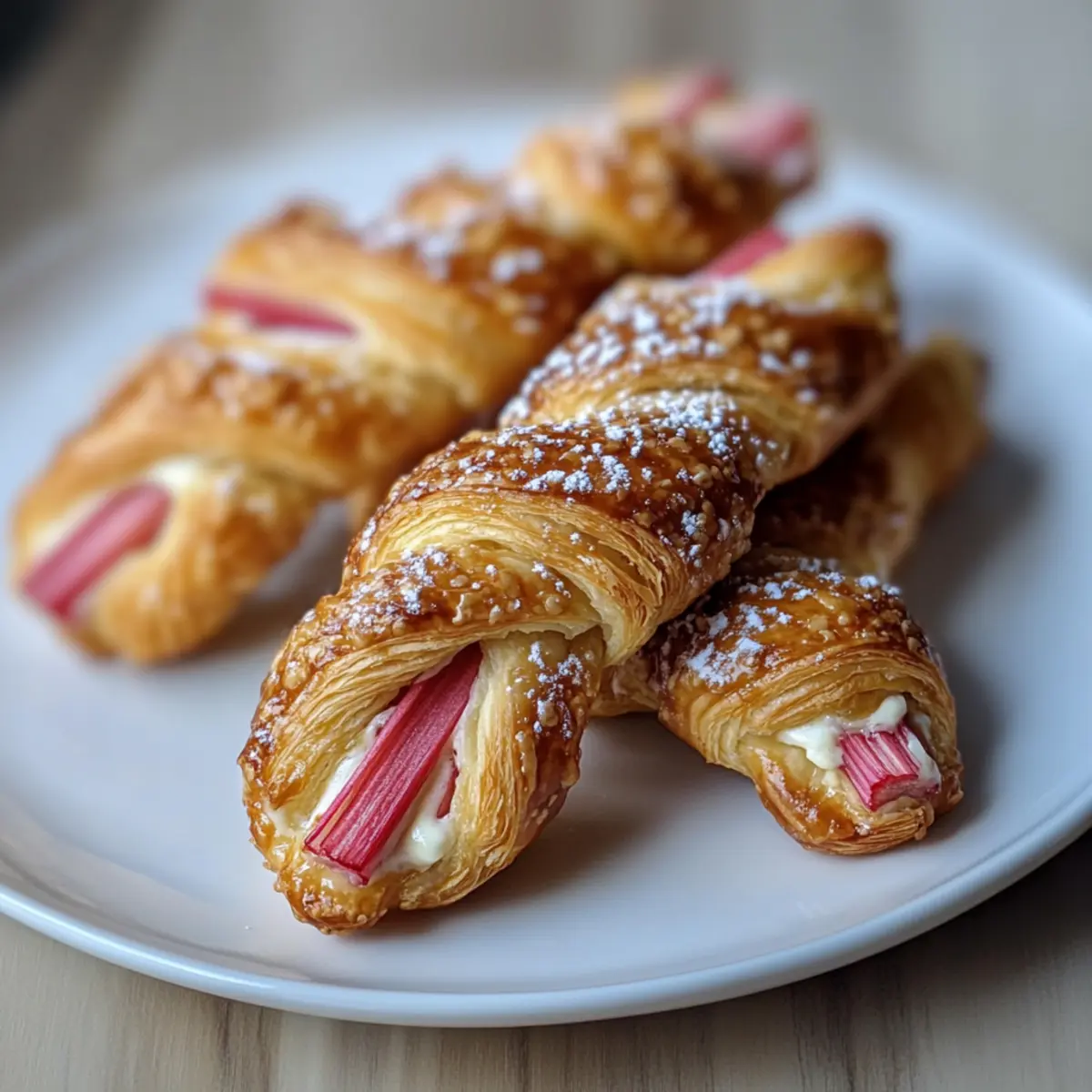 - Assemble the Twists: Spread cream cheese filling on half of the pastry, sprinkle drained rhubarb, fold over, and cut into strips. Twist and place on a baking sheet.
