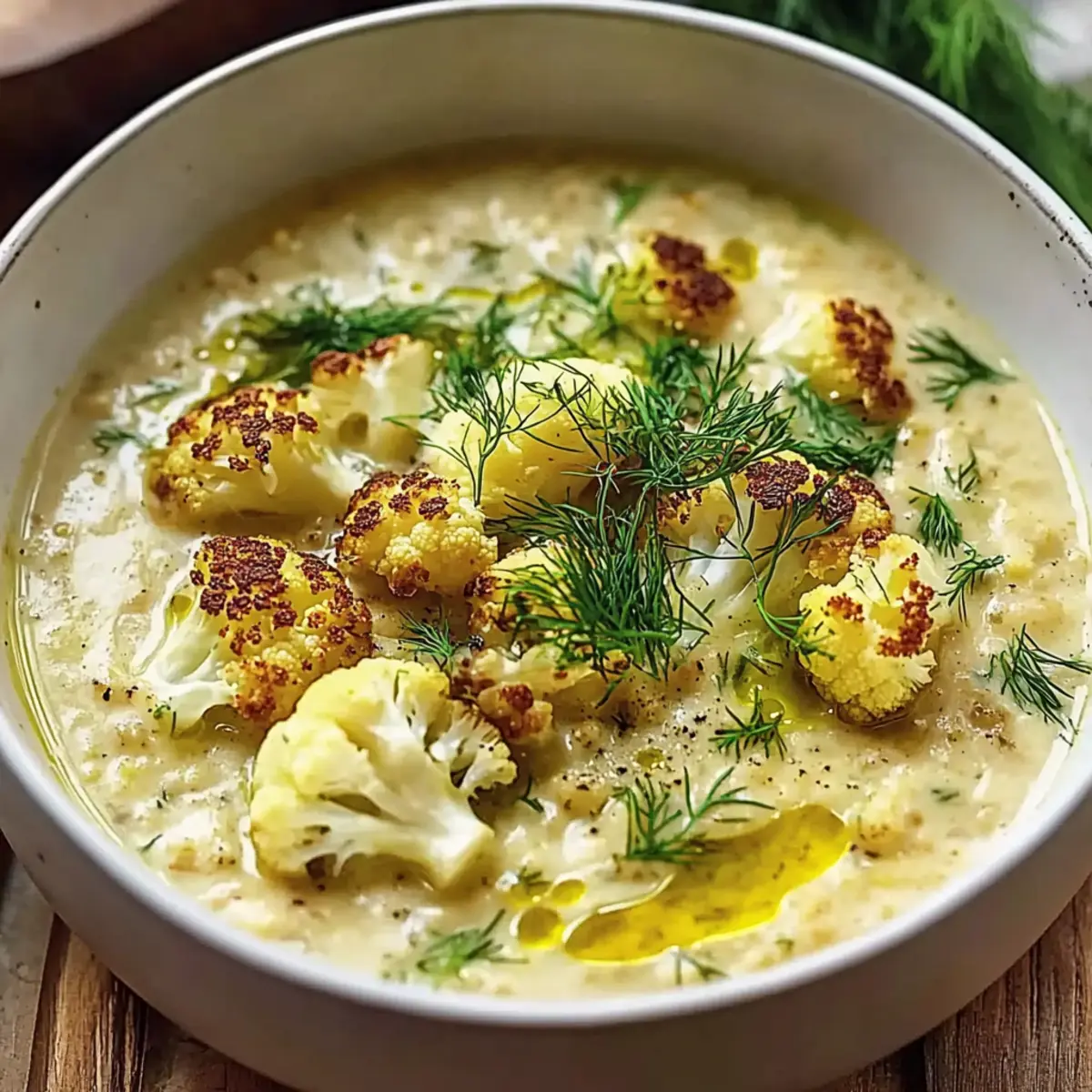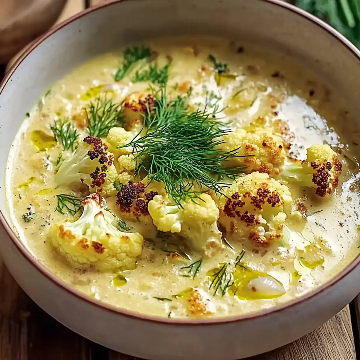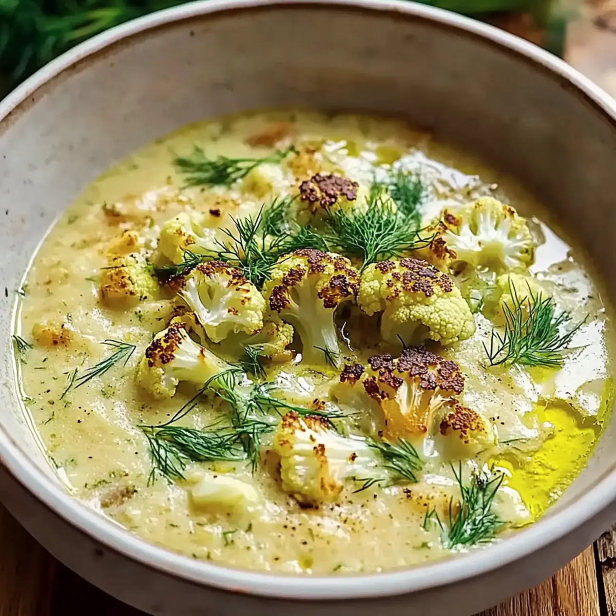 Gently reheat the soup over low heat, stirring frequently to avoid boiling. Taste and adjust the seasoning with more salt or pepper as needed. Once heated through, ladle the rich Mediterranean cauliflower soup into bowls and finish with a sprinkle of fresh dill. This colorful garnish not only adds freshness but also elevates your dish, making it ready for serving.