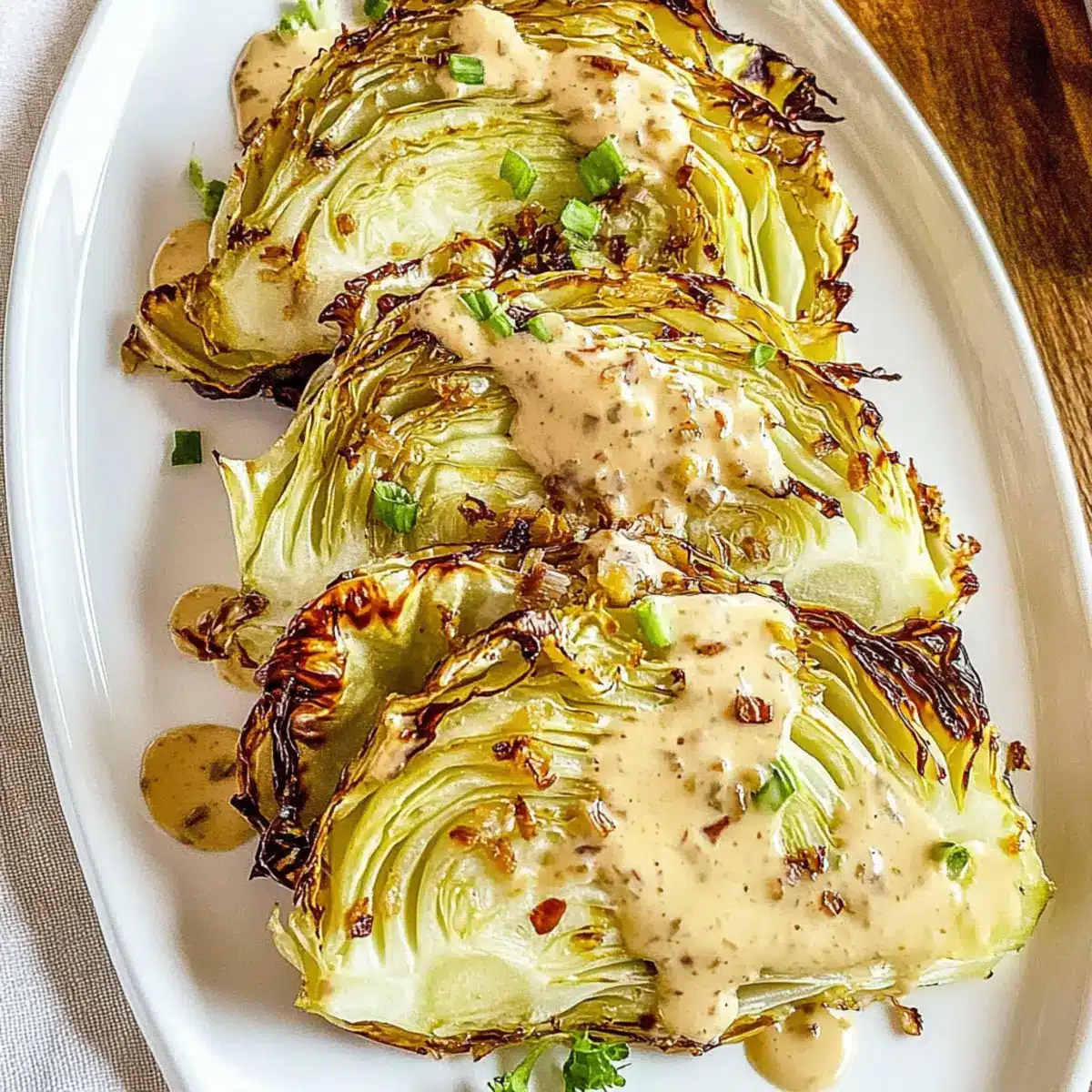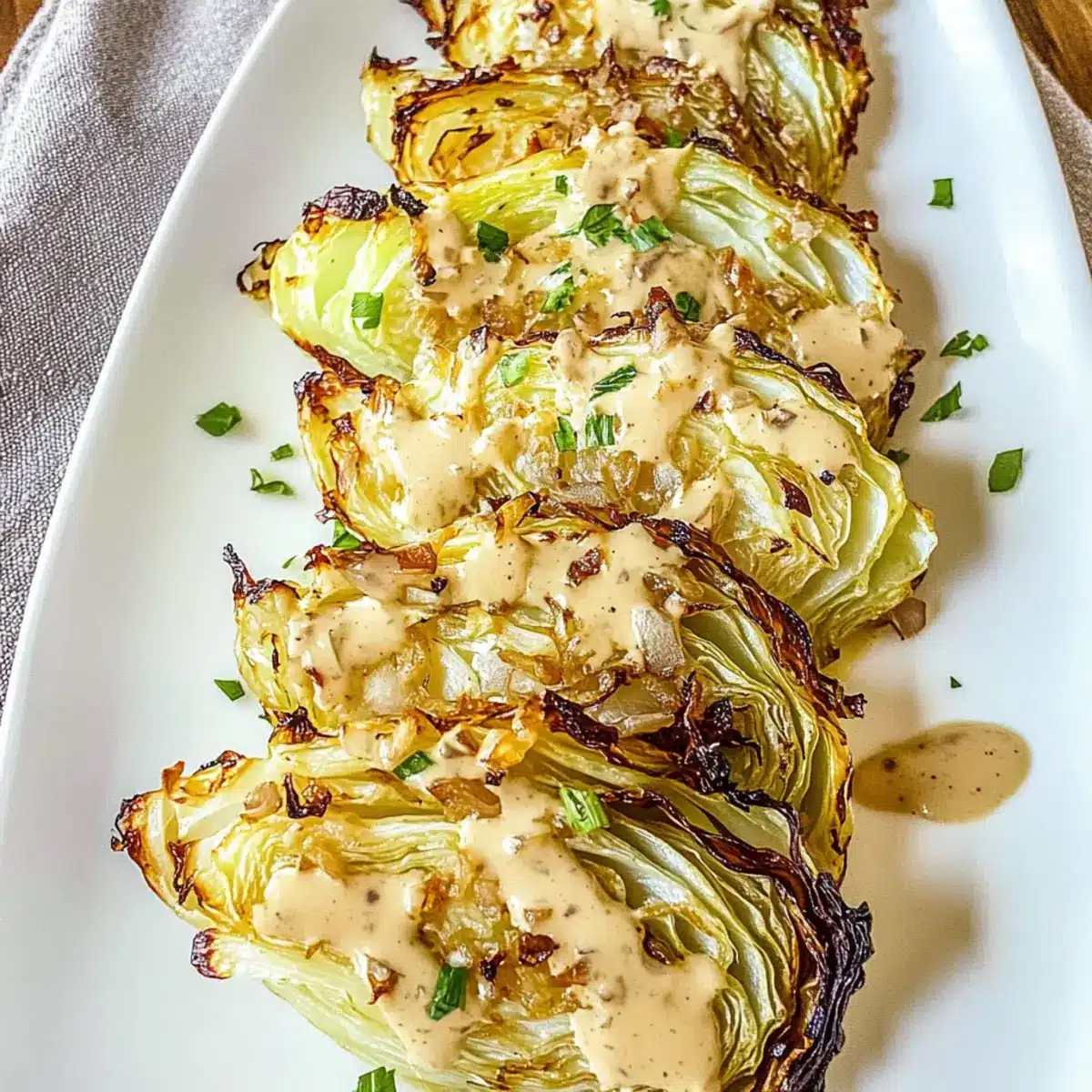 Once your cabbage is perfectly roasted and crispy, transfer it to a serving platter. Drizzle the amazing onion Dijon sauce generously over the top. For a vibrant finishing touch, sprinkle with freshly chopped chives or parsley. This adds not just flavor but also an enticing pop of color to your dish, making it truly appetizing!