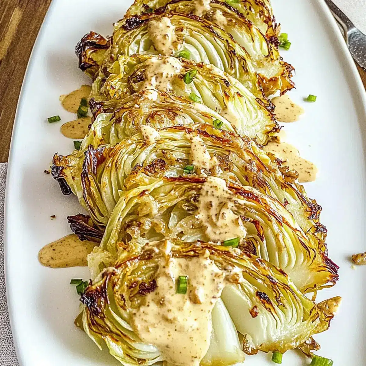 Crispy Perfection: Don’t shy away from darkened edges; they add a delicious crunch and enhance the flavor of your roasted cabbage with amazing onion Dijon sauce.