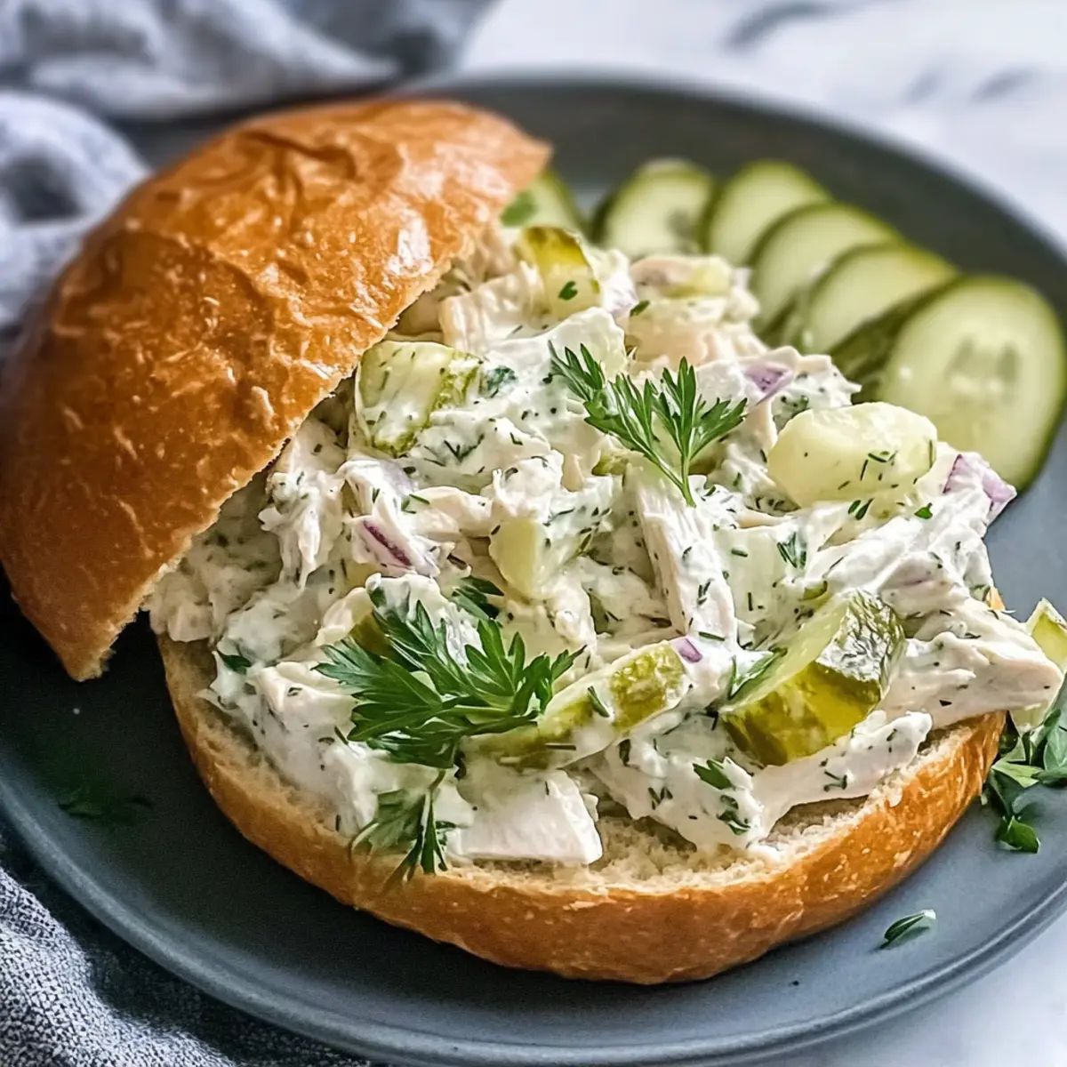 As I rummaged through my fridge, searching for the perfect lunch idea, I stumbled upon a jar of dill pickles—my secret ingredient for a delightful twist in today’s meal. This Savory Dill Pickle Chicken Salad is a game-changer, offering a rich, creamy taste that’s both tangy and satisfying. With prep time clocking in at just 10 minutes, it’s the ideal solution for busy individuals or anyone tired of uninspiring fast food. This easy-to-make salad can be customized with mayo substitutes and gluten-free options, making it not only delicious but versatile too. Whether you’re packing it for a picnic or serving it for a quick weeknight dinner, this recipe is bound to impress. What creative variations will you try to make it your own?