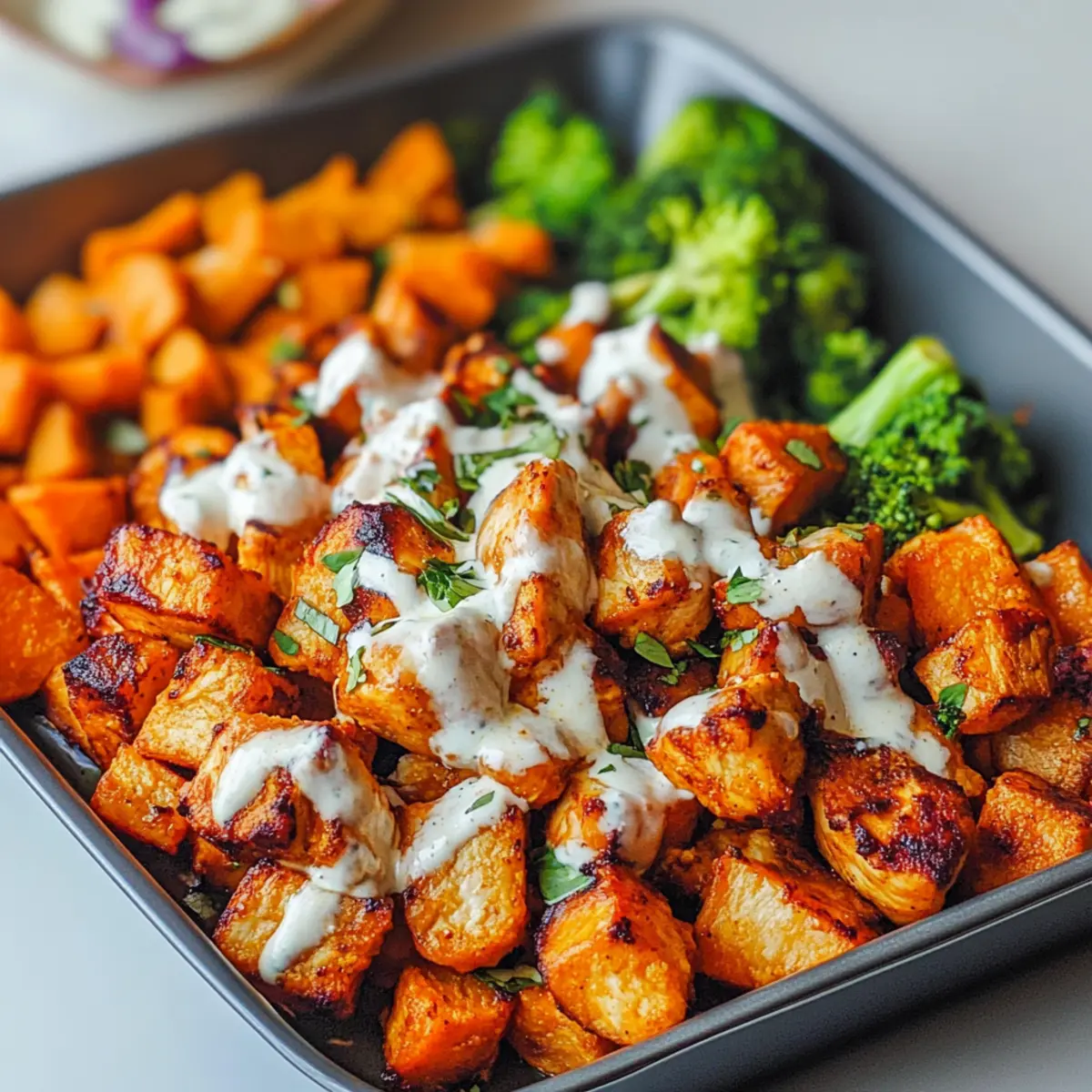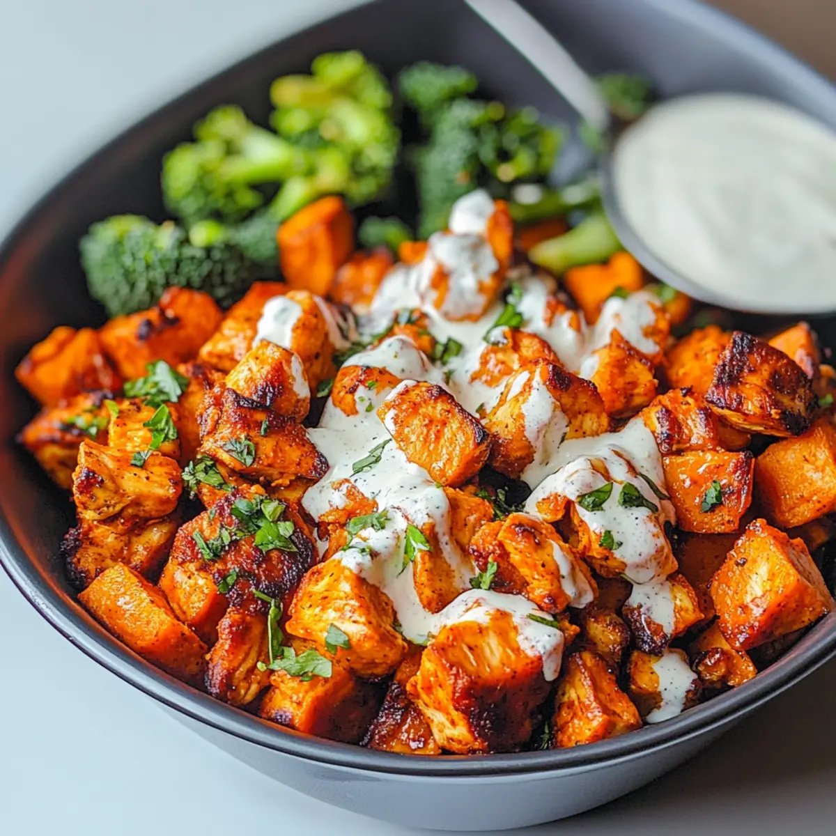 Simplicity Meets Flavor: This Sheet Pan Buffalo Chicken and Sweet Potato Bowls recipe is incredibly easy to whip up—perfect for those hectic weeknights.