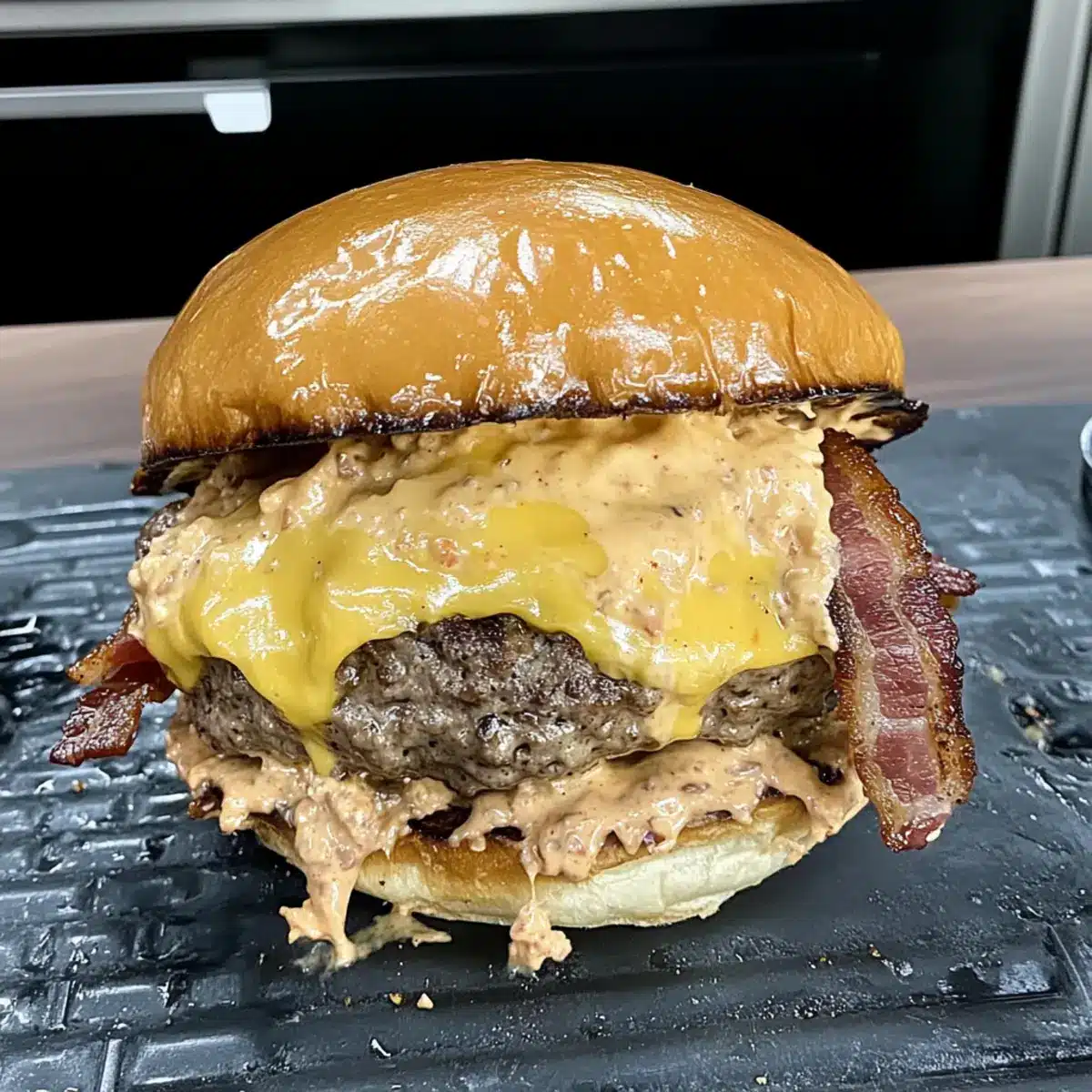 - Assemble the burgers with a toasted bun, baconnaise sauce, cheesy patty, and more baconnaise sauce before topping with the other bun.