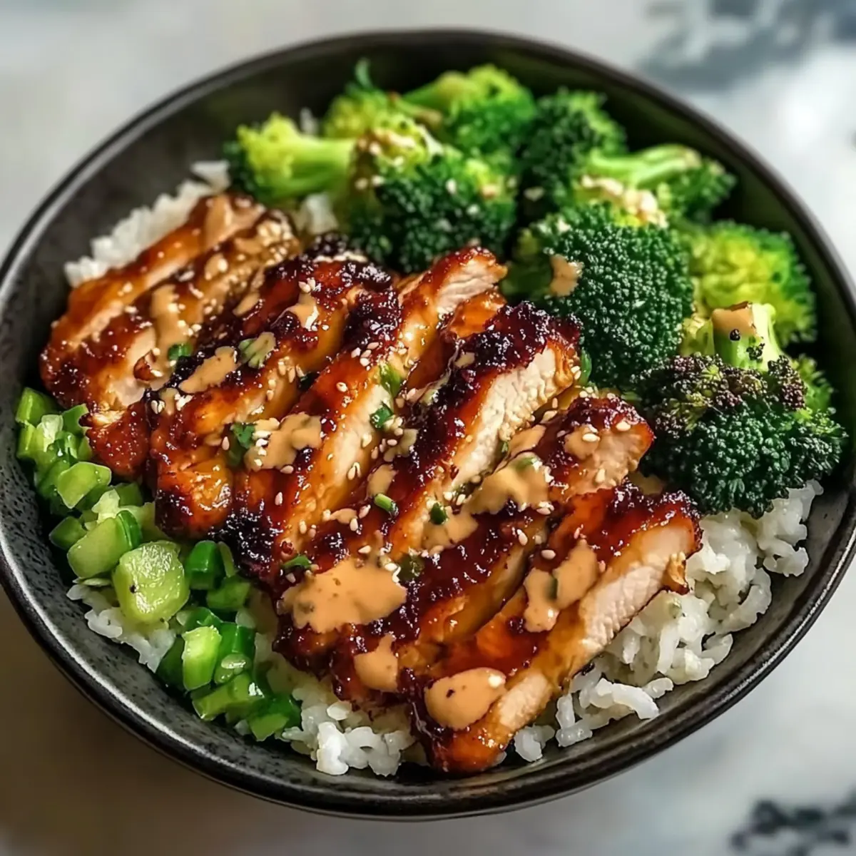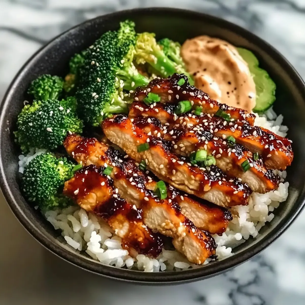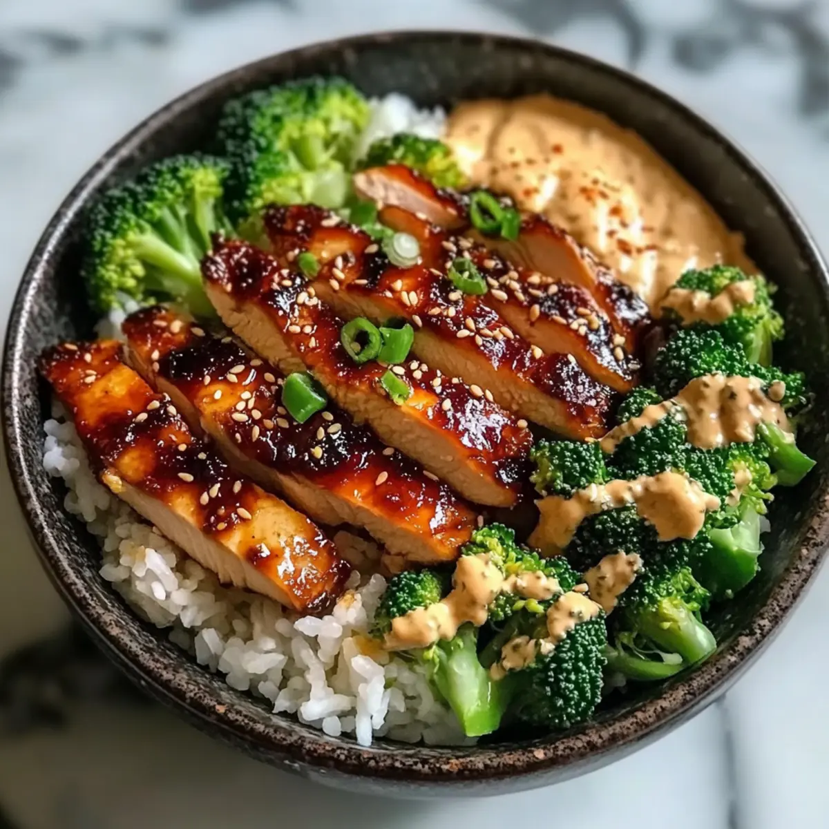 - Assemble the bowls by layering rice, chicken, and broccoli, then drizzle with spicy mayo and sprinkle with sesame seeds.