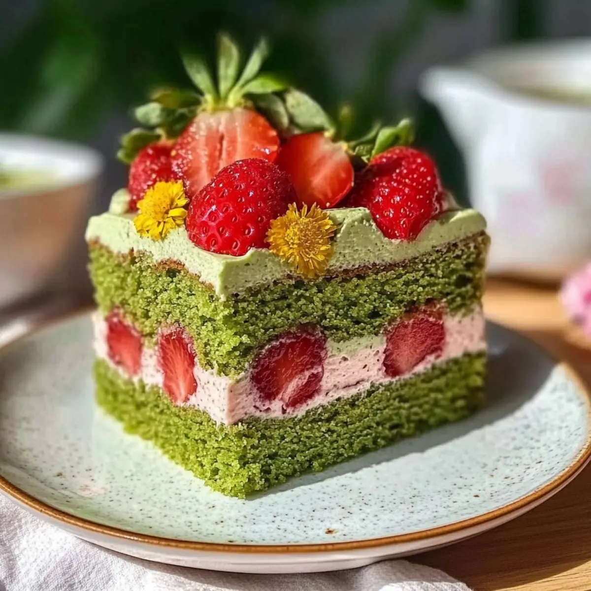 - Frost the cake with the matcha frosting, garnishing with fresh strawberry slices or dusting of matcha powder. Chill before serving.