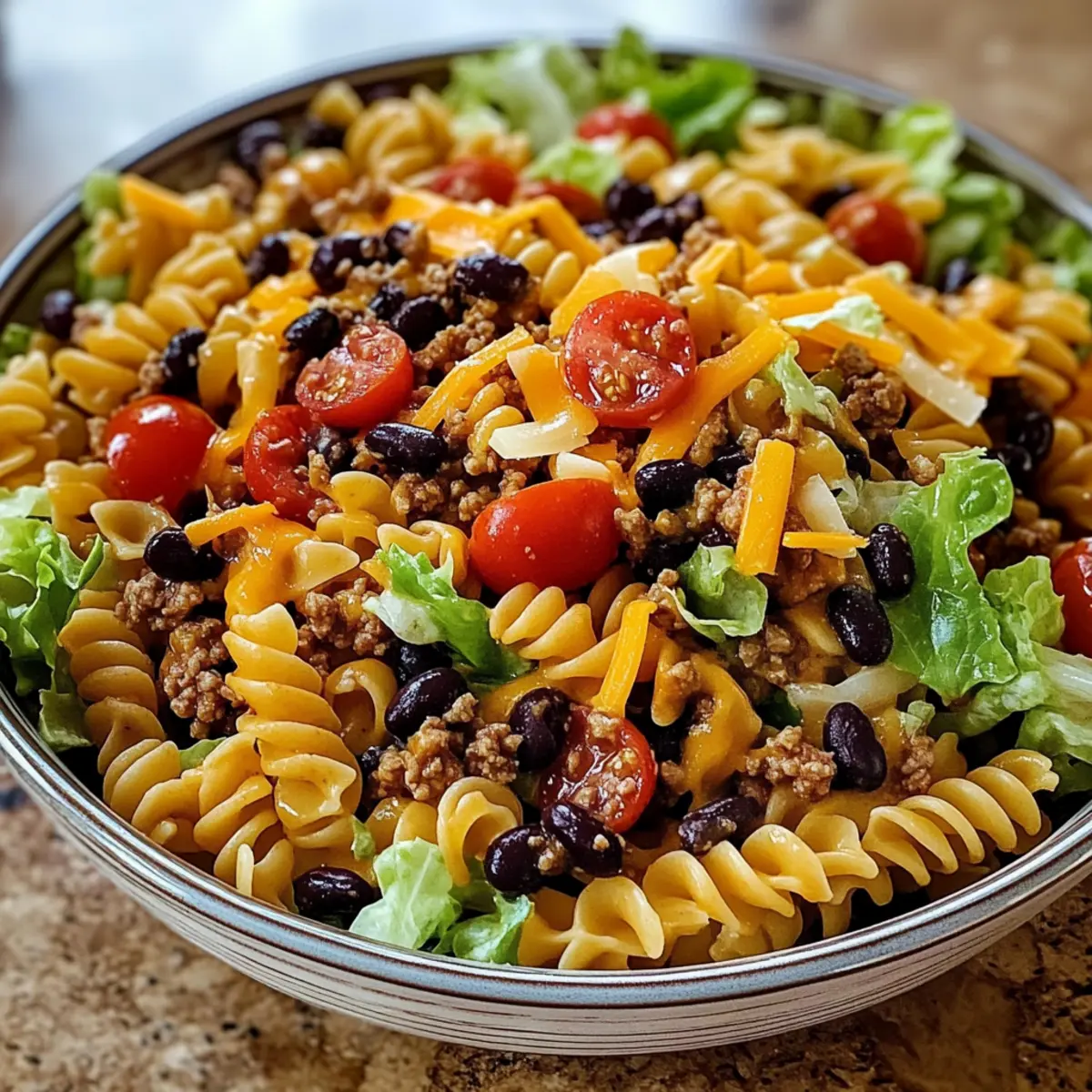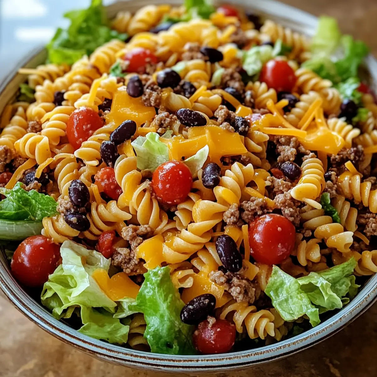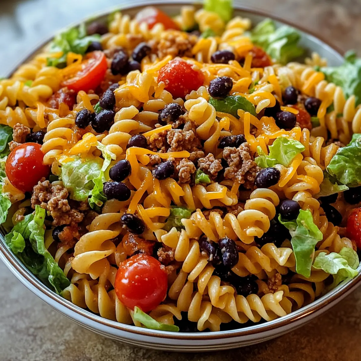 - In a large mixing bowl, combine cooked rotini, seasoned beef, halved cherry tomatoes, drained black beans, and shredded cheddar cheese. Fold in chopped lettuce for a fresh crunch.