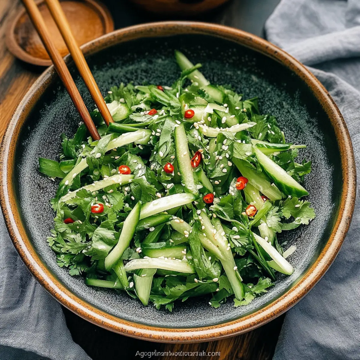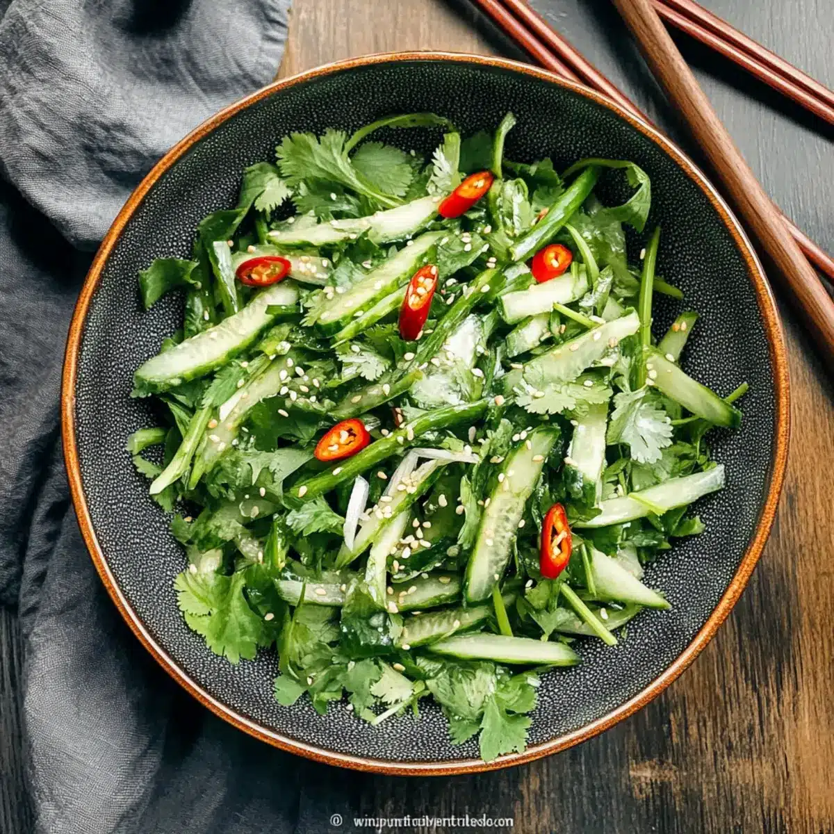 - In a large mixing bowl, gently combine the chopped cilantro, sliced cucumber, chopped chilis, and green onions. Toss the ingredients lightly to ensure they are evenly distributed without bruising the greens.