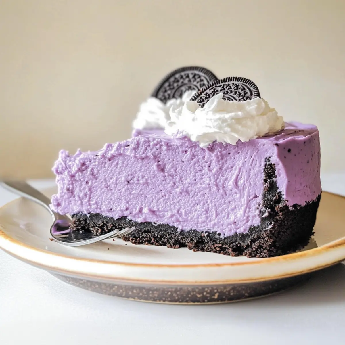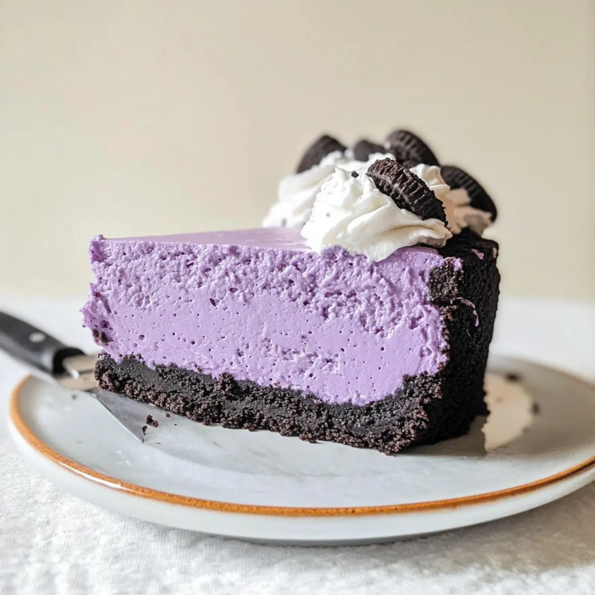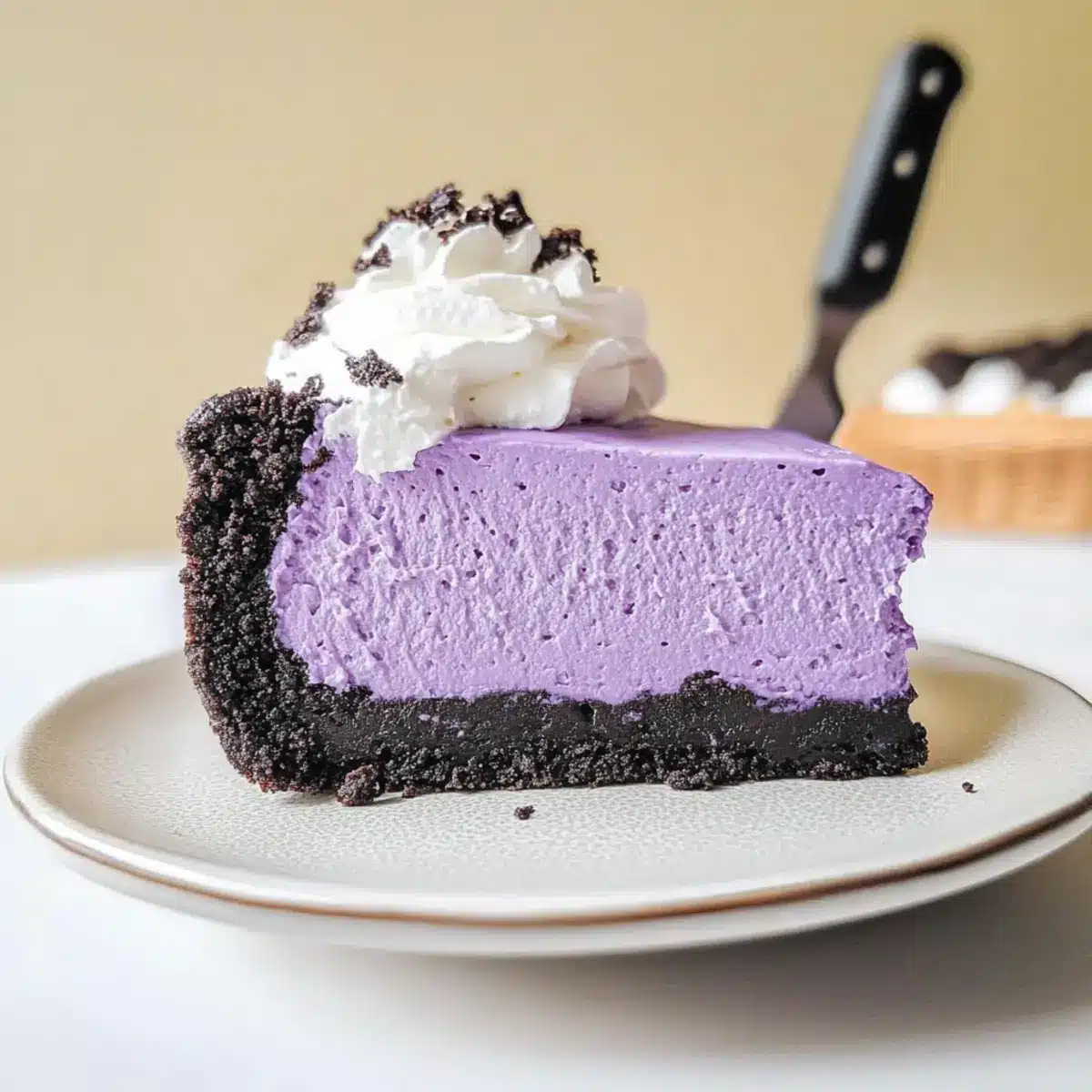 Before serving, top your chilled cheesecake with light coconut whipped cream for a delightful touch. To elevate presentation, consider adding ube sprinkles on top. Slice into pieces and take a moment to admire your beautiful Ube Cheesecake with Oreo Crust before diving in!