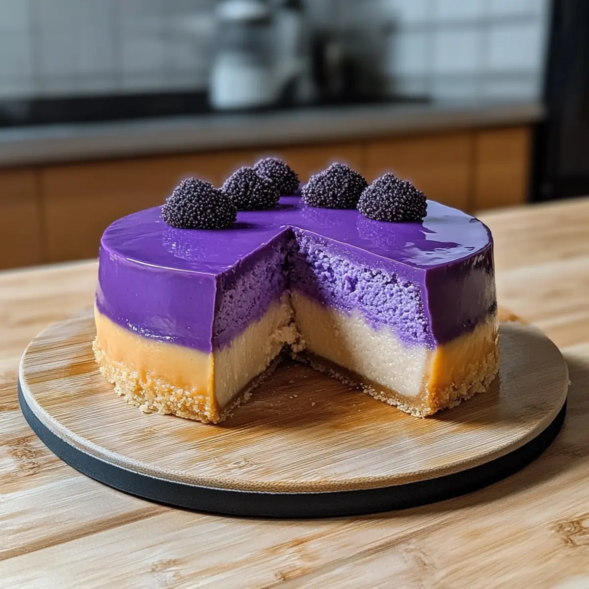Fresh Berries: Strawberries or blueberries provide a bright, tart element, cutting through the sweetness of the flan and offering a refreshing bite. The vibrant colors contrast beautifully with the purple cake.
