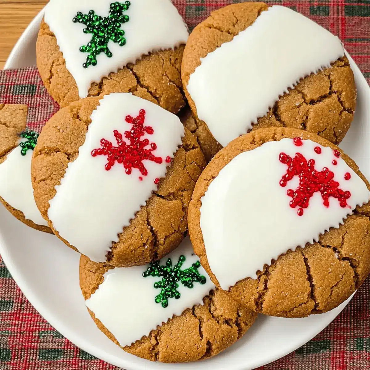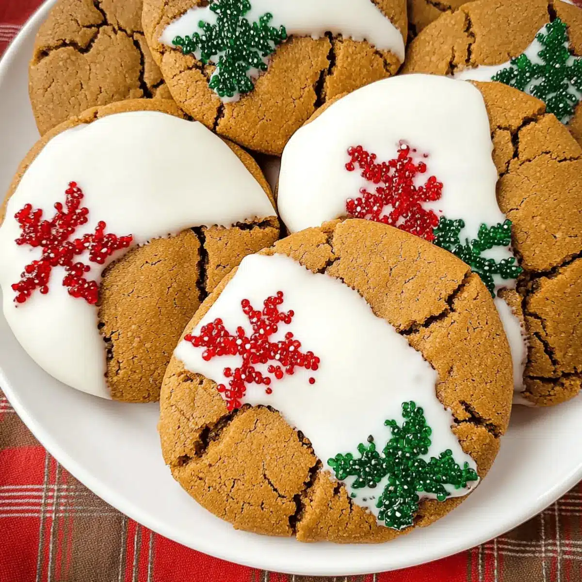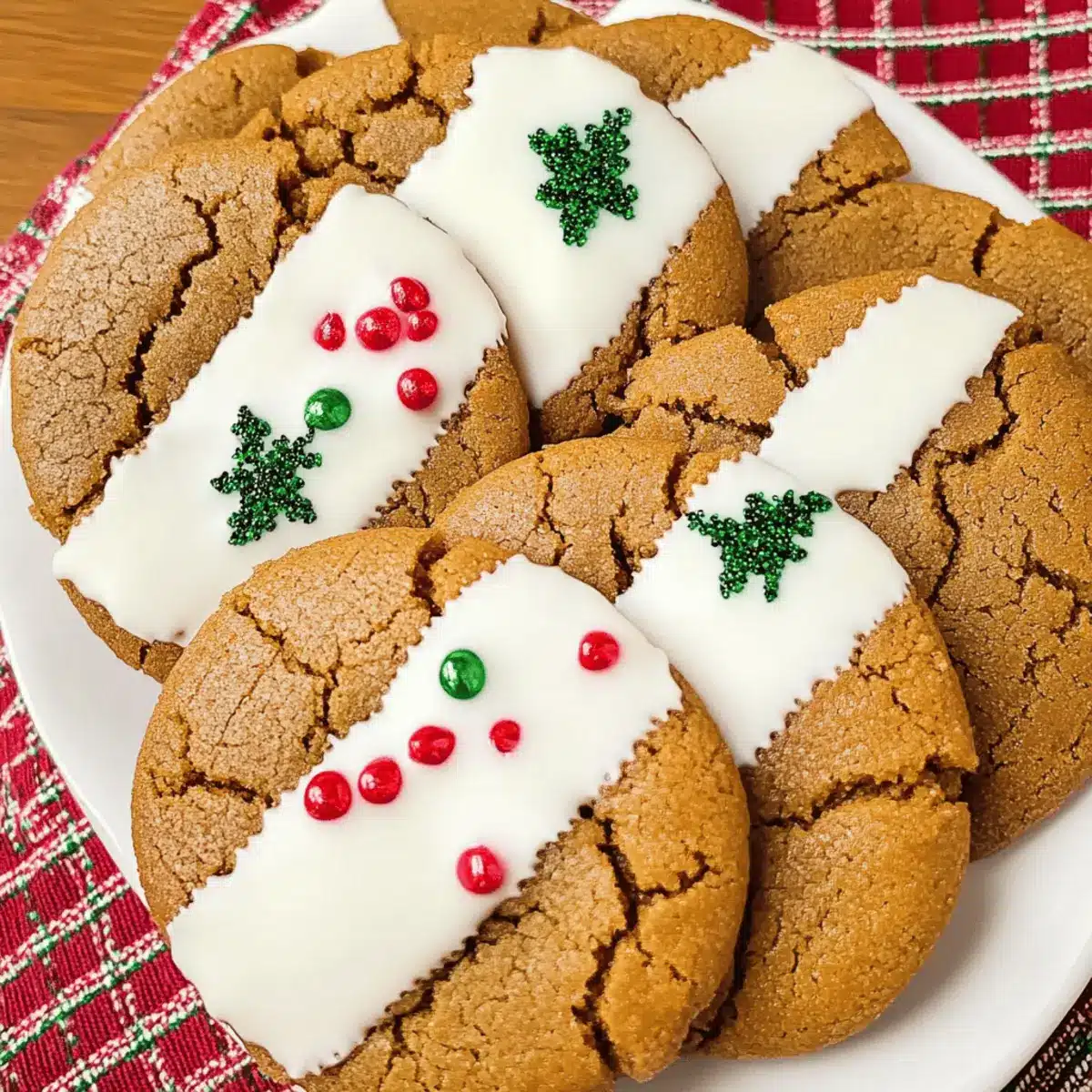 Dip each cooled ginger cookie halfway into the melted white chocolate, allowing any excess to drip off. Place the dipped cookies on a sheet of parchment paper. If desired, while the chocolate is still warm, sprinkle festive red and green candy melts or holly sprinkles over the top for a charming holiday touch. Let the chocolate set completely before serving.